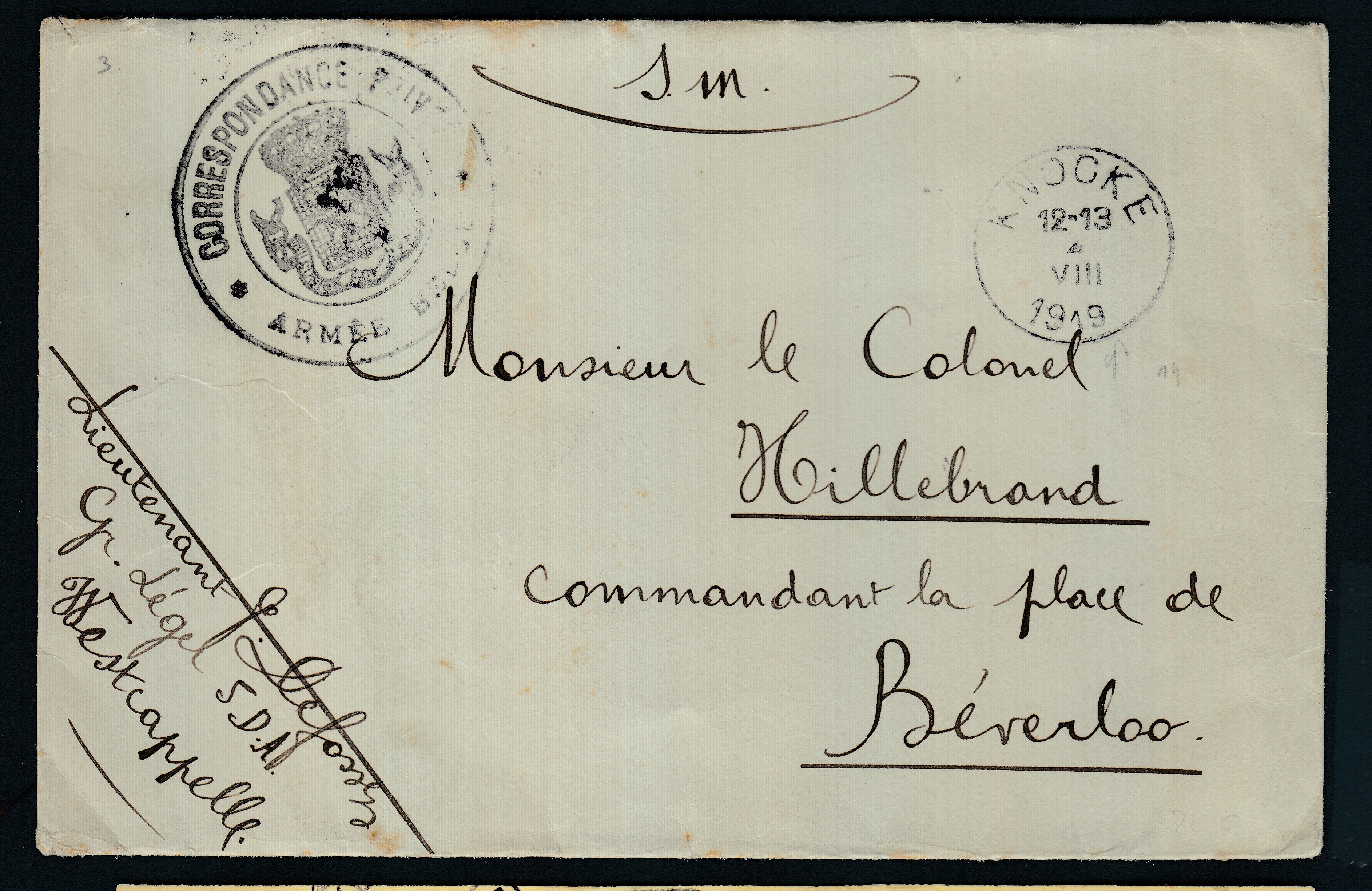 Cachet avec armoiries « CORRESPONDANCE PRIVEE /Armée belge » sur lettre expédiée en franchise de port de Knocke le 4.VIII.1919 à destination de Beverloo. Cachet d'arrivée à Léopoldbourg au verso.