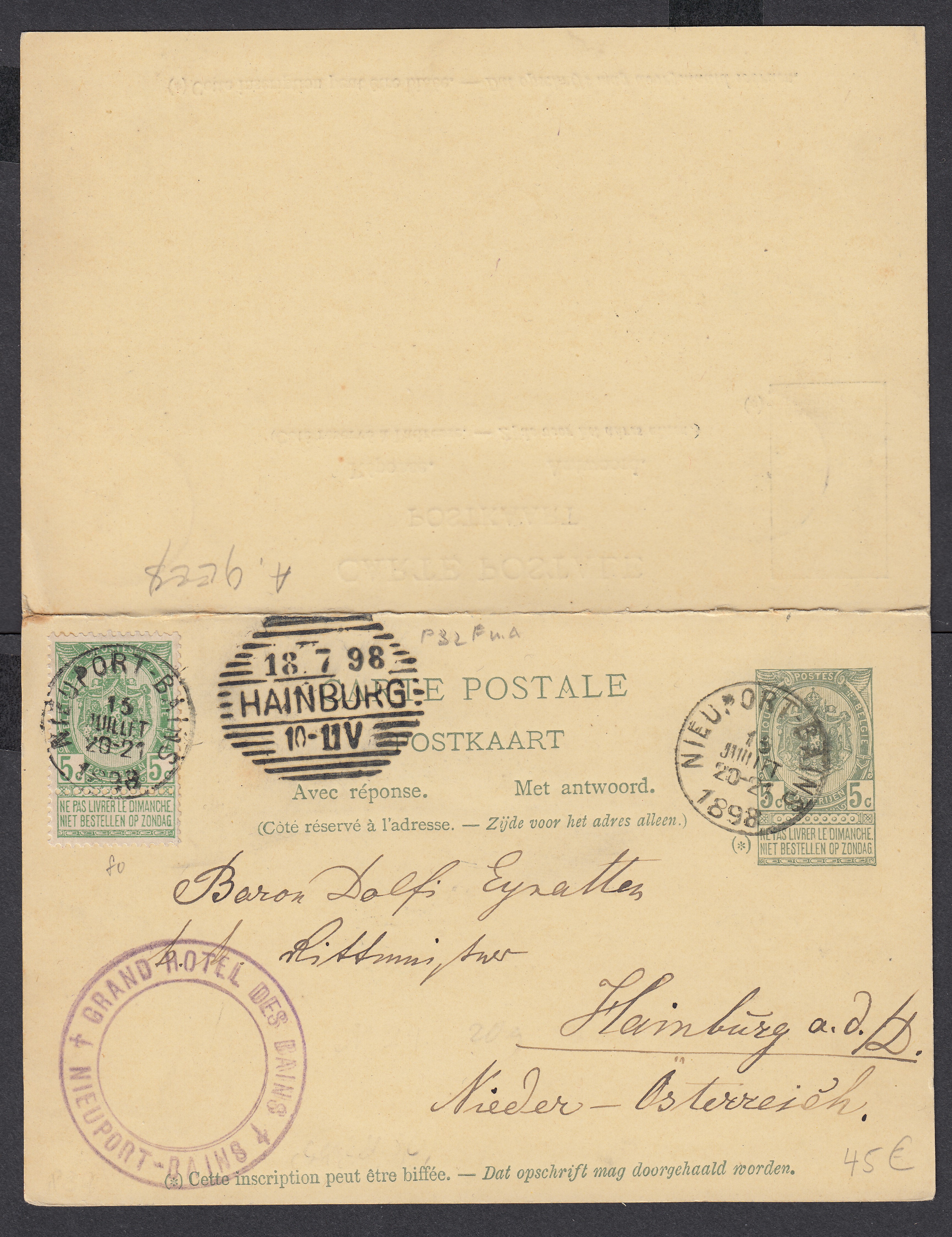 N°56 sur Ep5c type Tp N°56 expédié de Nieuport-Bains le 19 juillet 1898 à destination de Hainburg. Cachet d'arrivée au recto.