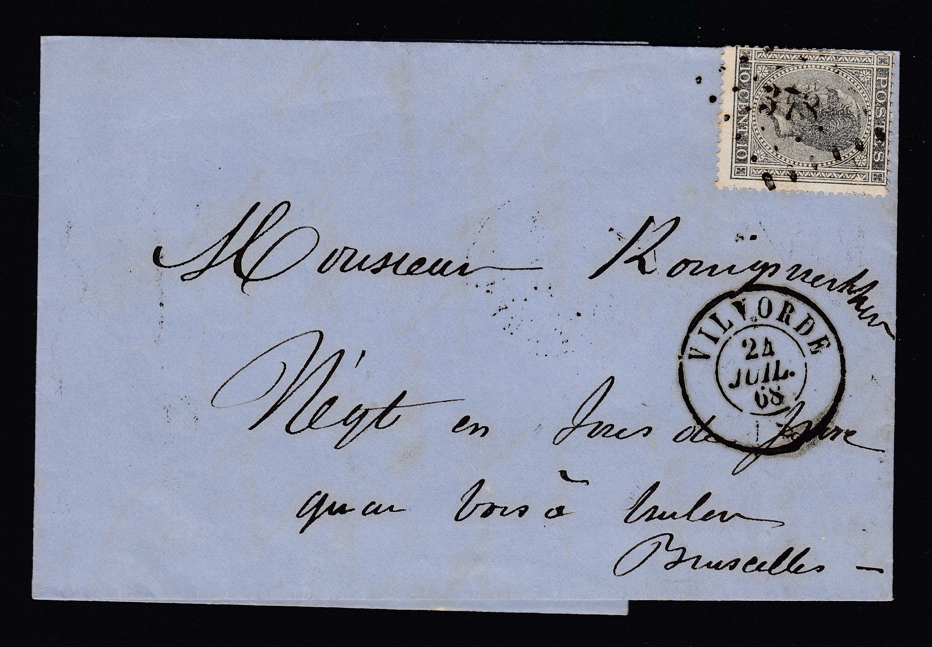 N°17 sur LAC expédiée de Vilvorde ( Lpts 378) le 24 juillet 1868 à destination de Bruxelles. Cachet d'arrivée au verso.