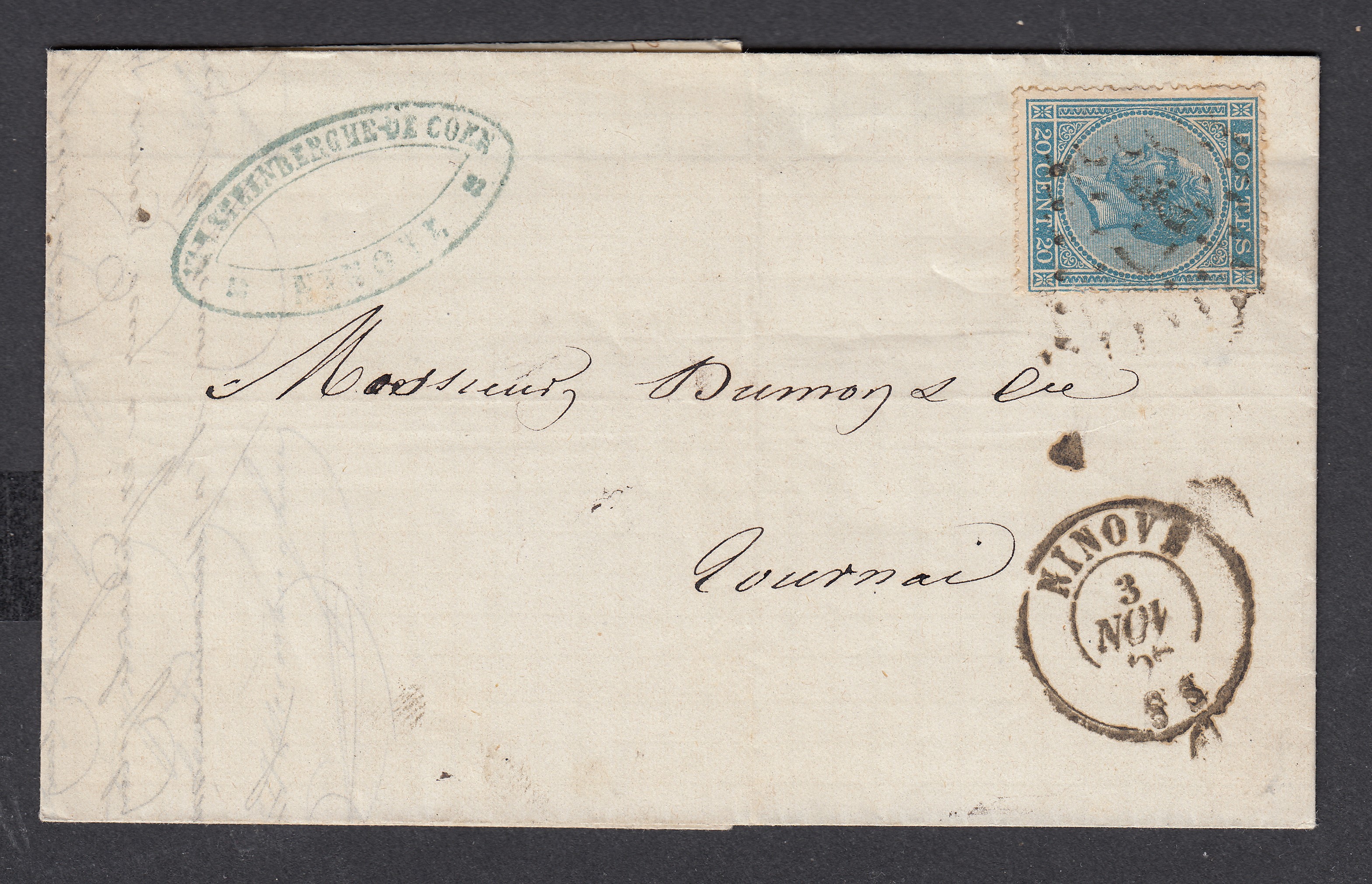 N°18 sur LAC expédiée de Ninove le 3 nov.1866 à destination de Tournay. Cachet d'arrivée au verso.