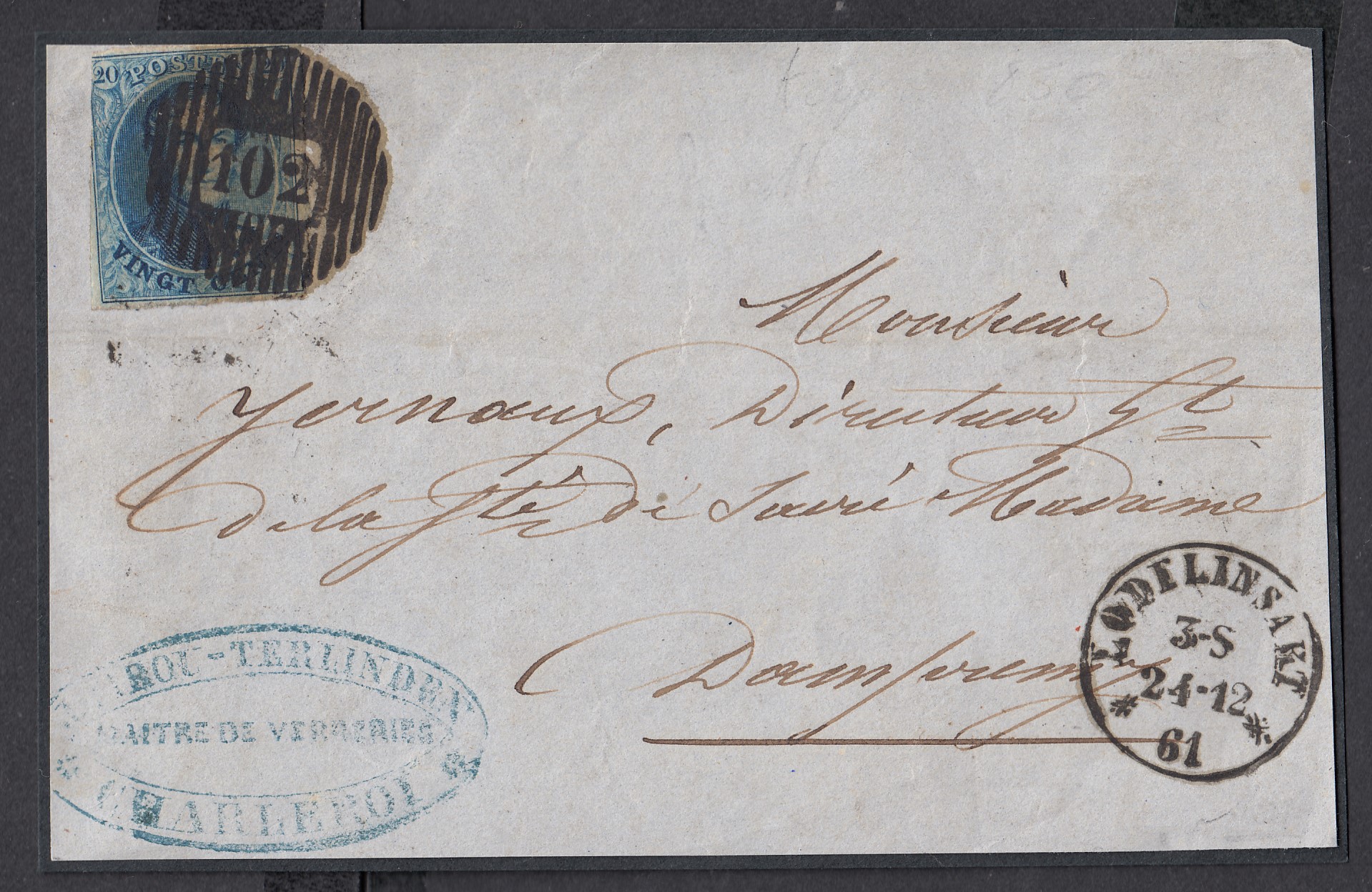 N°11A (3 marges) sur DEVANT de lettre expédiée de Lodelinsart (P102) le 24.12.61 à destination de Damprémy.