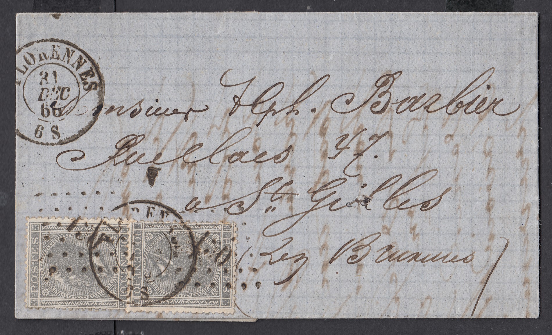 N°17 x2 sur LAC expédiée de Florennes (Lp130) le 31 dec 1866 ( Càd x2 dont un sur les Tp) à destination de St-Gilles-lez-Bruxelles. Cachet d'arrivée au verso.