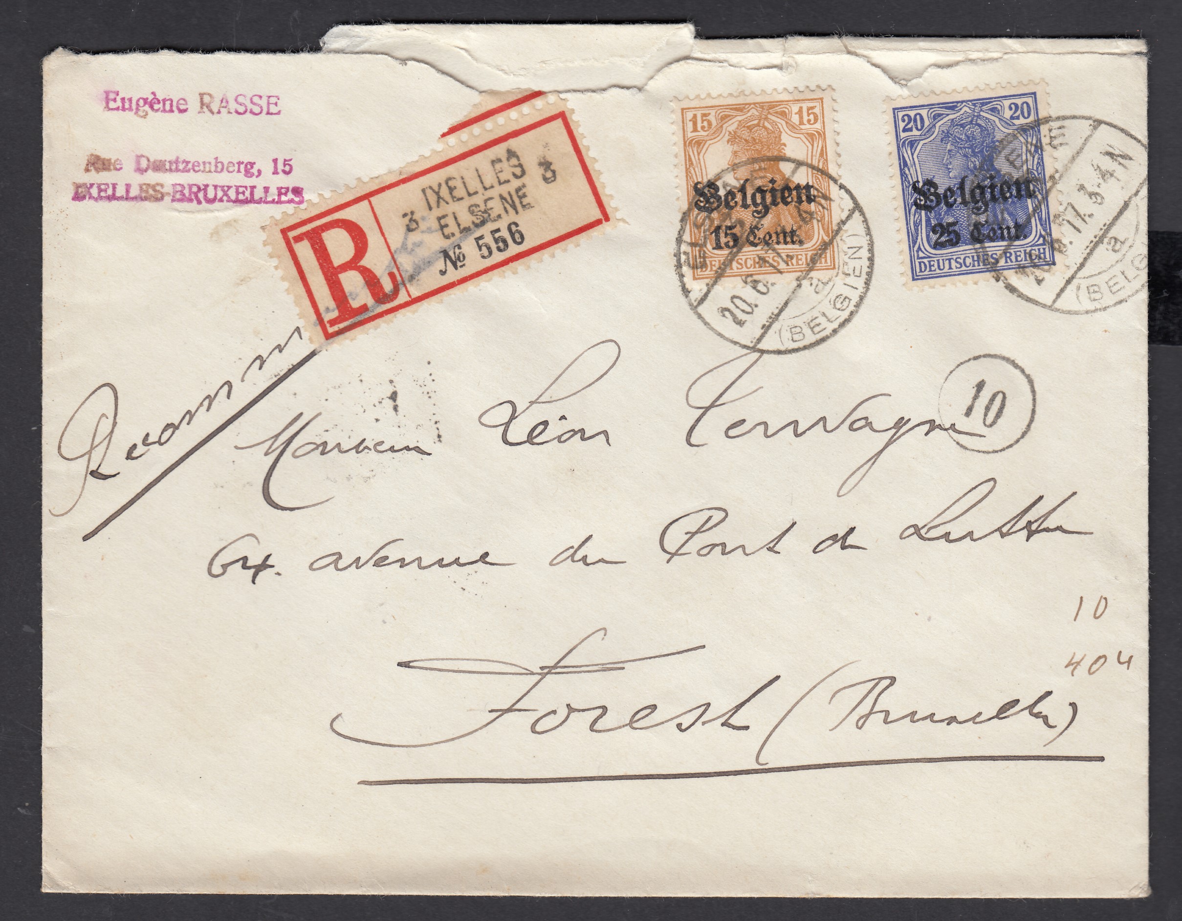 N°Oc15 +18 sur lettre expédiée en recommandé d'Elsene le 20.6.1917 à destination de Forest. Cachet d'arrivée au verso.