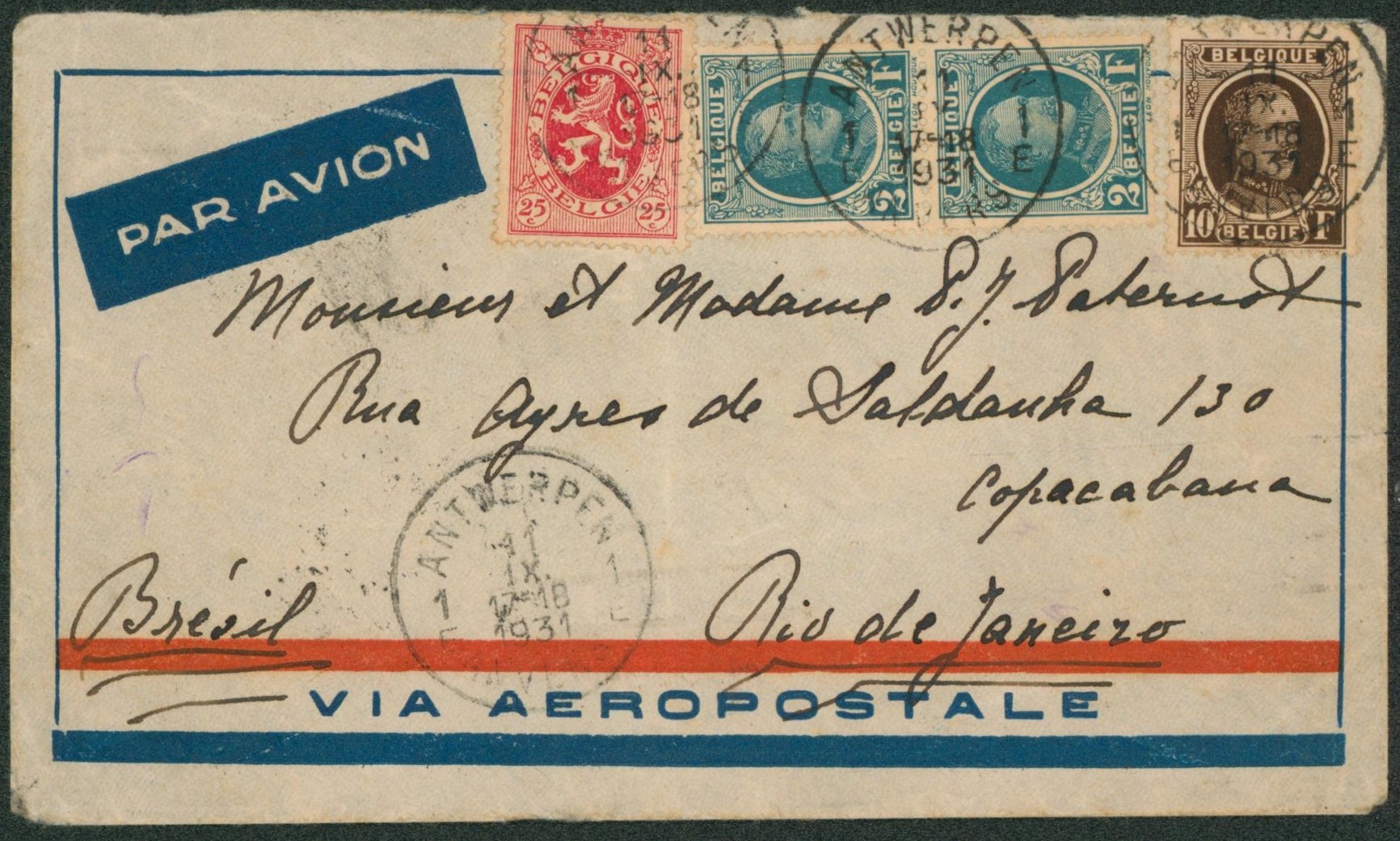 n°208 en paire, 210 et 282 sur lettre par avion de Antwerpen 11/11 > Rio De Janeiro (Brésil). TB