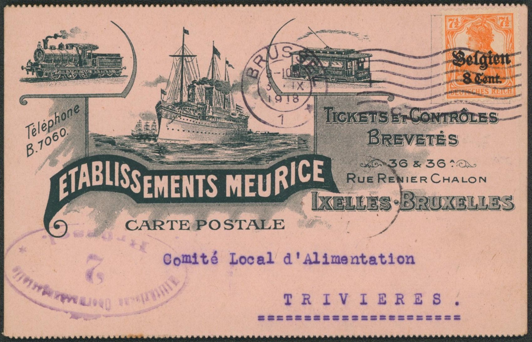 OC15 sur CP imprimée (Etablissement Meurice, tickets et controles brevetés, transports) expédié de Bruxelles + censure n°2 > Trivières.