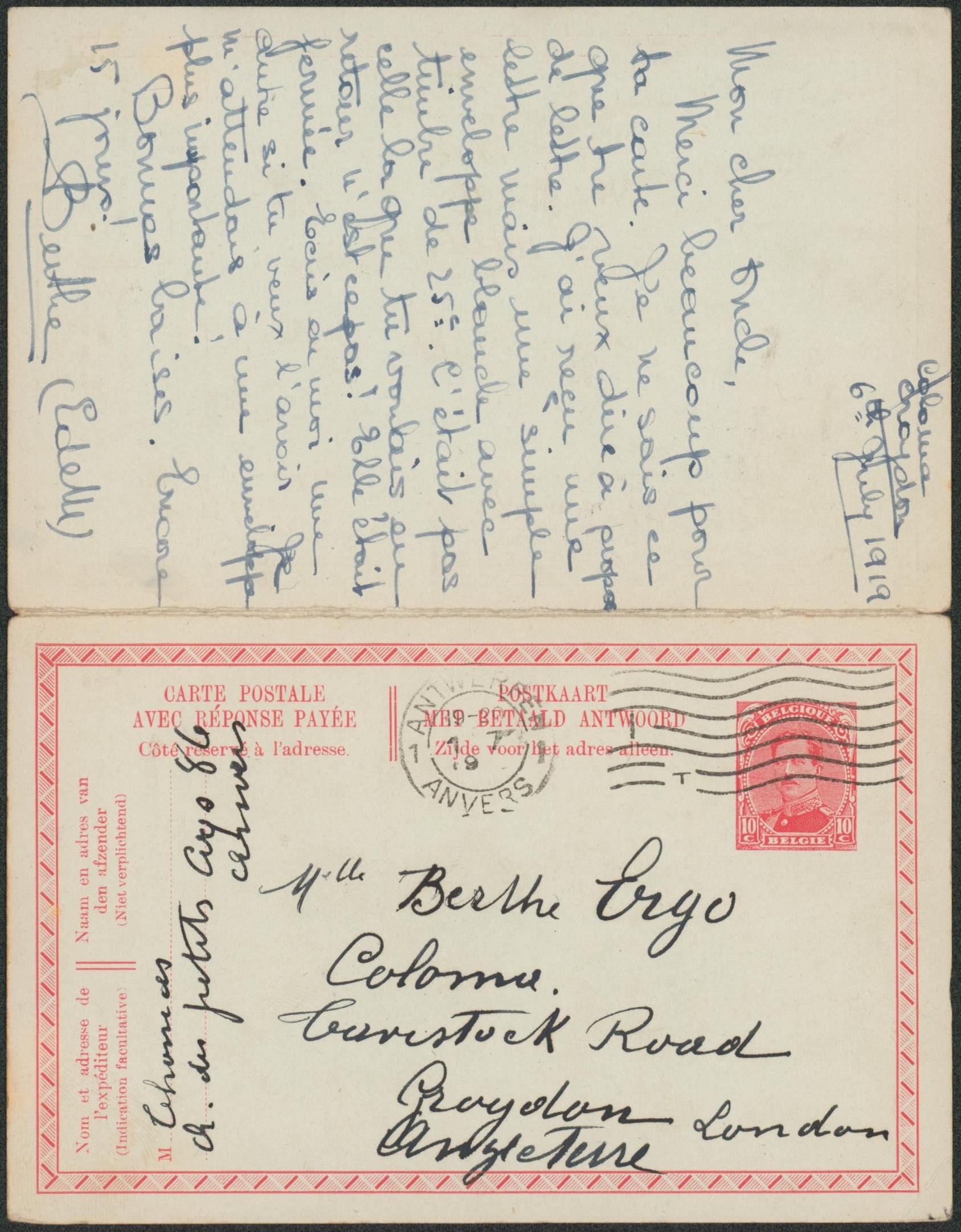 EP (double) au type 10ctm rouge Albert I (SBEP n°53A) de Antwerpen / Anvers > Croydon (Angleterre) + retour. Complet, TB