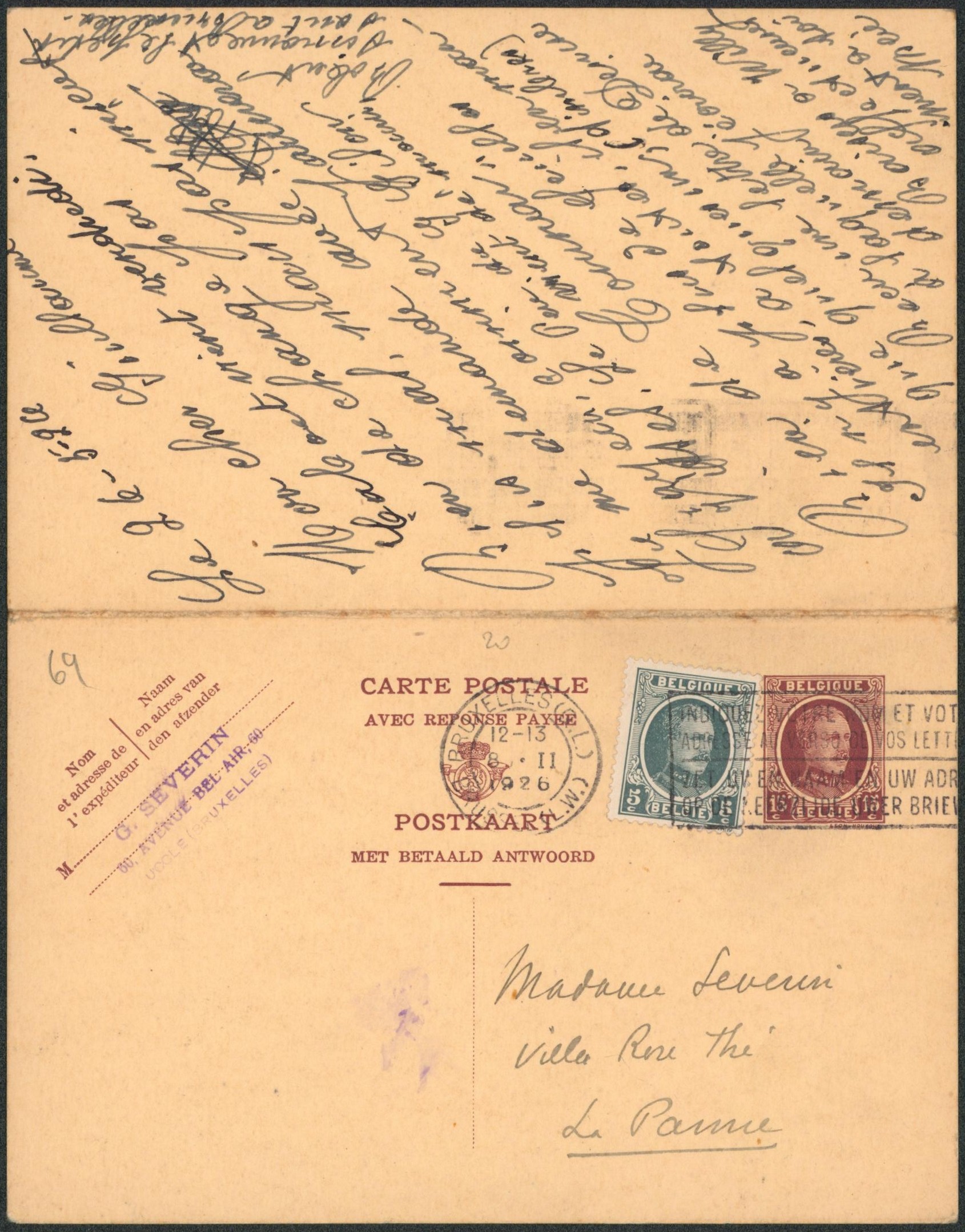 EP (double) au type 15ctm lilas Houyoux + n°193 (SBEP n°69) de Bruxelles > la panne + retour sans affranchissement, taxé !