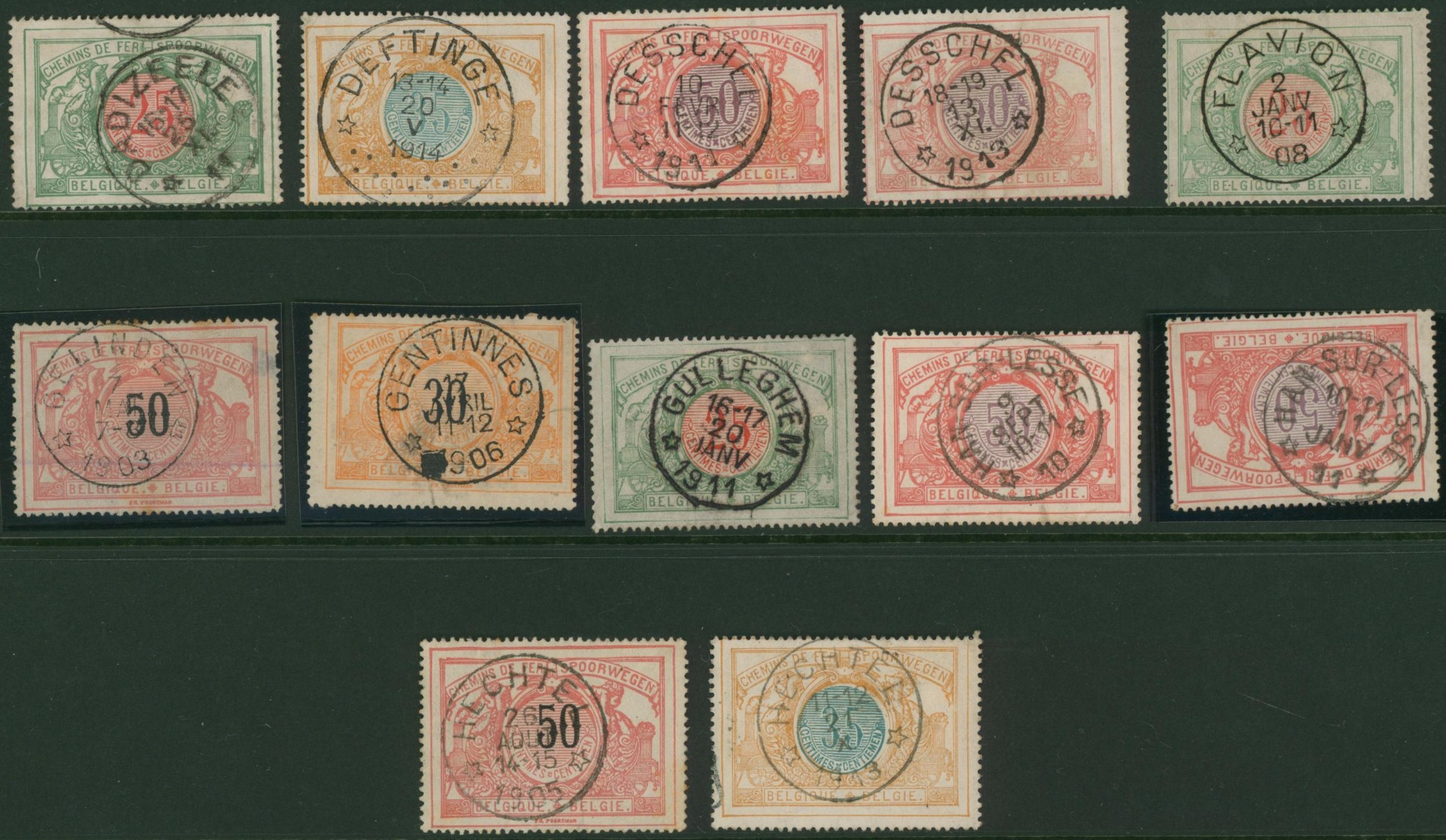 Chemin de fer (bilingue, chiffre bicolore) - sélection de 12 oblitérations relais sur valeurs faciales diverses. Lettre D > H