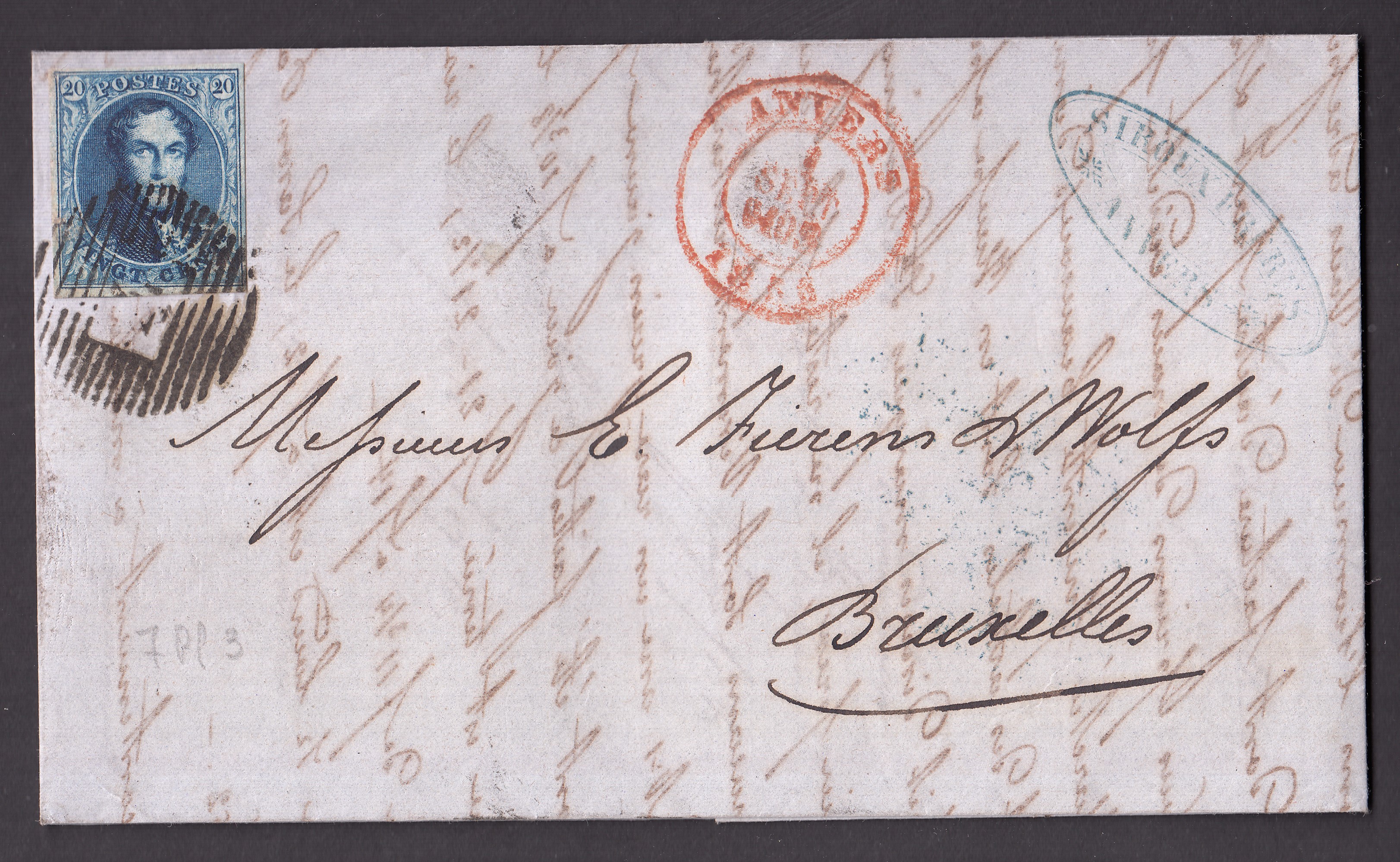 N°7 margé ( Planche 3 G.Guyaux) sur LAC expédiée d'Anvers le 1er sept.1855 vers Bruxelles. Cachet d'arrivée au verso.