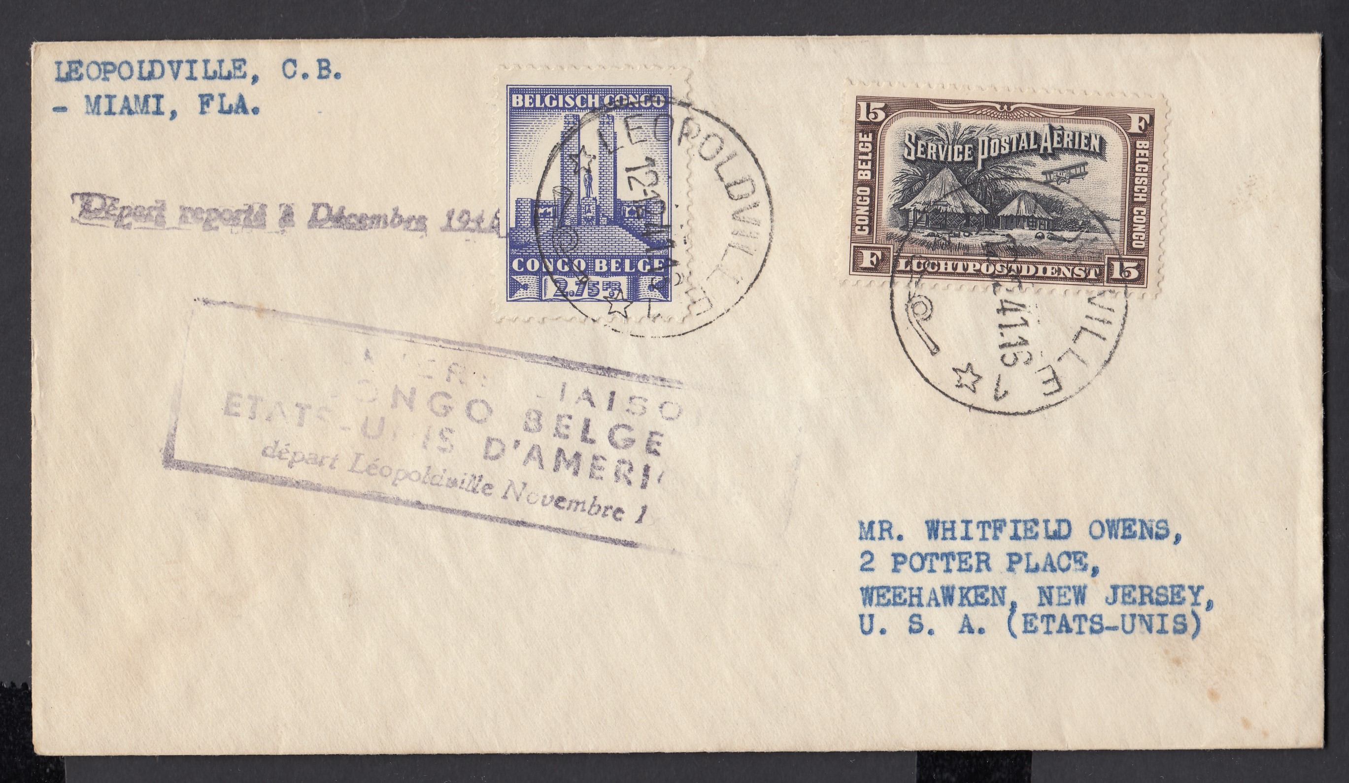 N°222 sur lettre expédiée par avion de Léopoldville le 12.12.1941 ( Cachet rectangulaire « 1er LIAISON..... ») à destination de Weehawken, USA. Cachet de passage à Miami au verso.