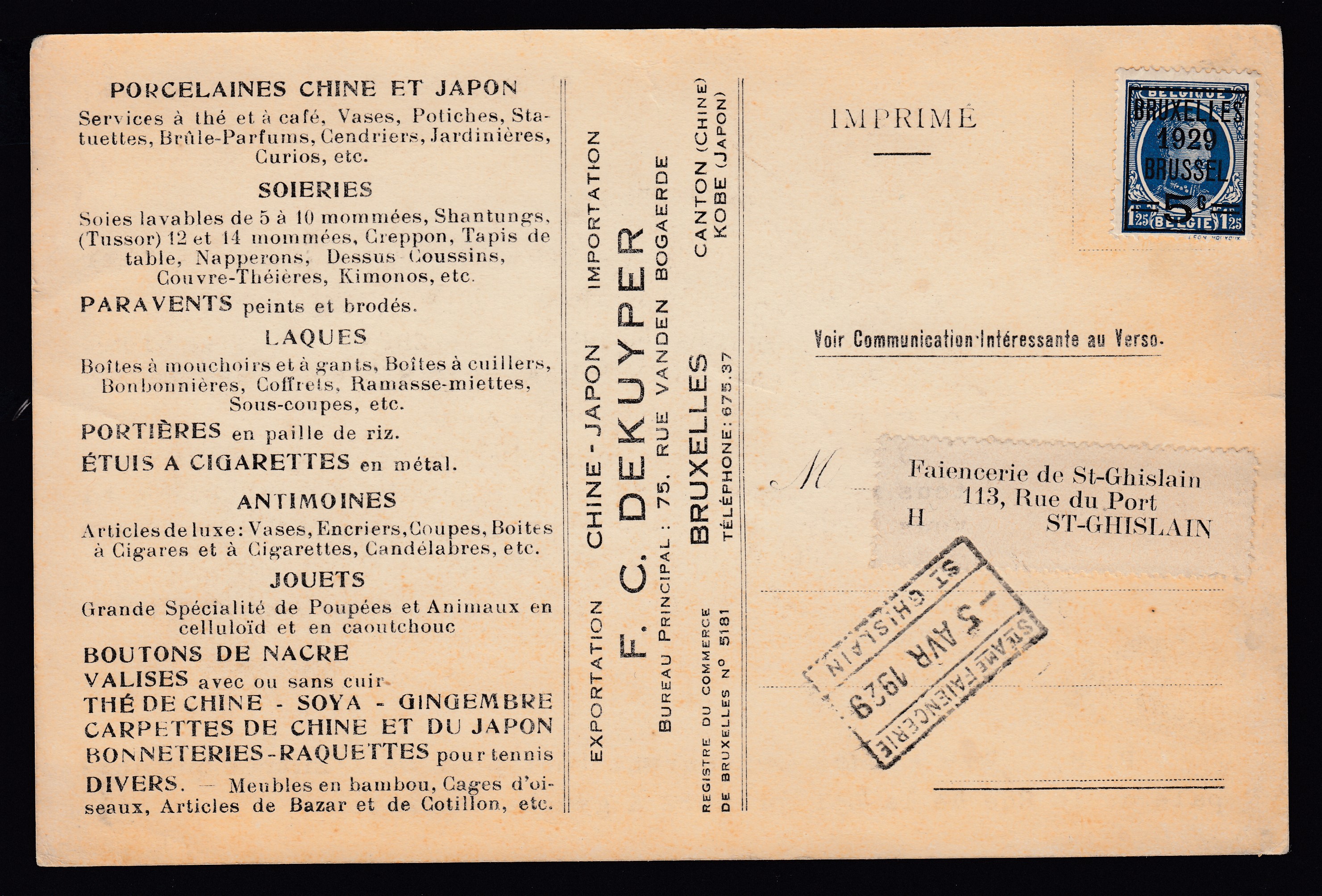 N°275 sur imprimé publicitaire expédié de Bruxelles à destination de St-Ghislain. Cachet rectangulaire des C.F.le 5 AVR 1929.