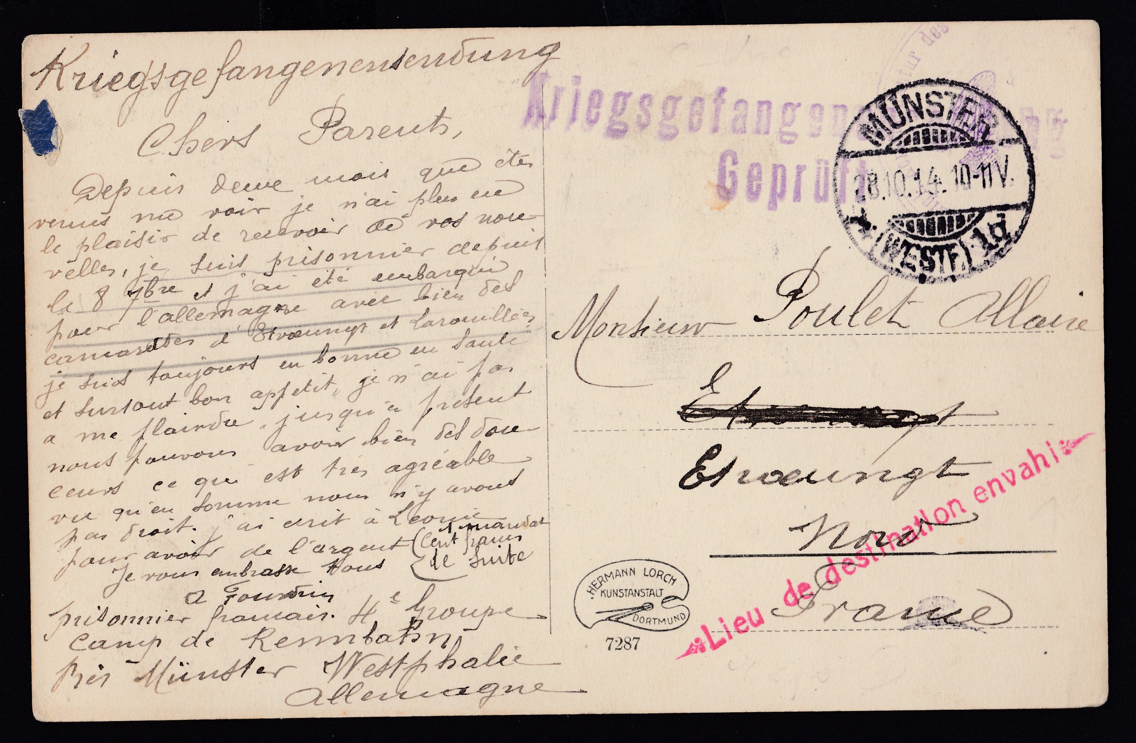 Cp expédiée en franchise de port ( PDG) du camp de Munster le 28.10.1914 ( Griffe bilinéaire de censure allemande) à destination du Nord de la France. Griffe linéaire en rouge « Lieu de Destination envahi ».