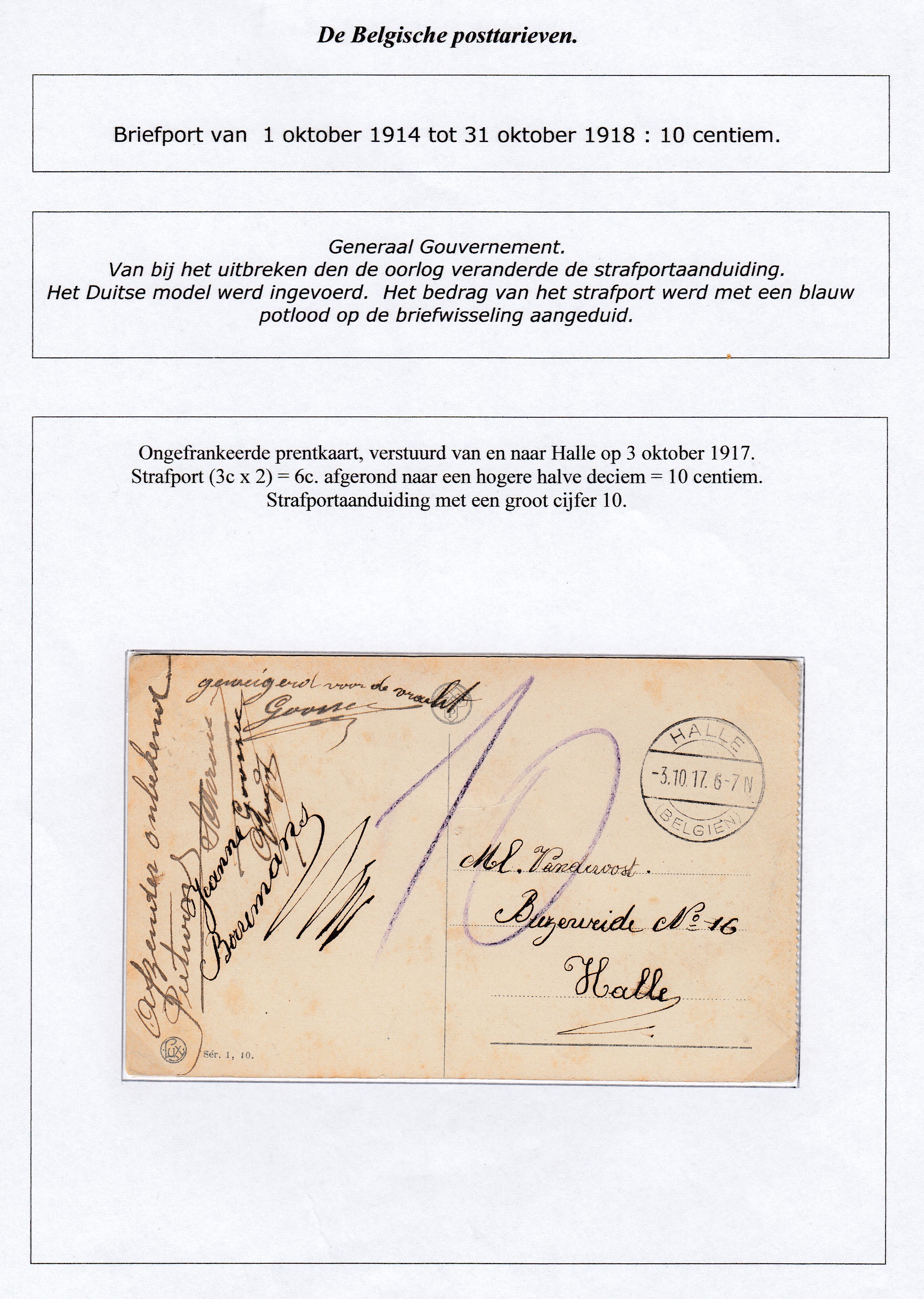 Monté sur feuille avec explications en néerlandais : Cp expédiée sans affmt de et à destination de Halle ( Cachet allemand à pont) le 3.10.1917. Taxée 10c au cryon « 10 » au verso.