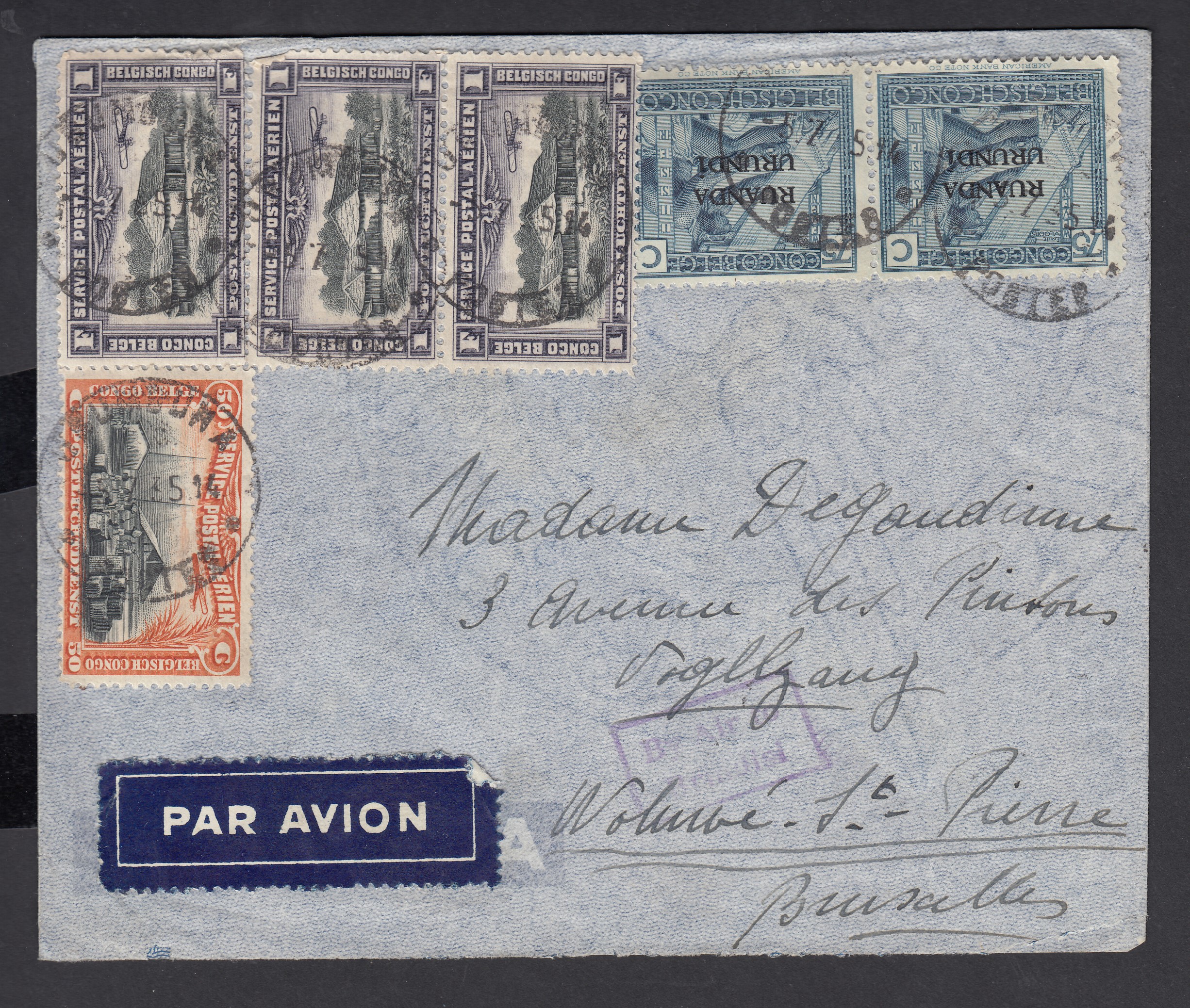 Ruanda-Urundi : N°Pa1 +Pa2 en bande de 3 du Congo +Ruanda-Urundi N°69 en paire sur lettre expédiée par avion d'Usumbura via Kigoma le 8 JY 1935 vers Bruxelles.