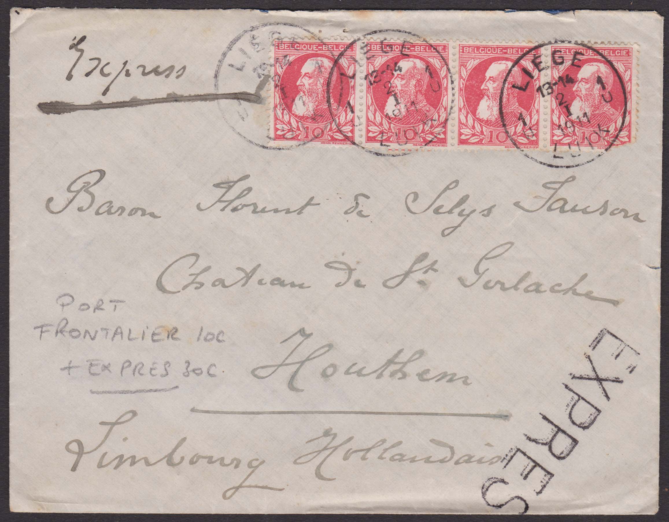 N°74x4 obl Liège 2/1/1911 en port frontalier par expres vers Houthem, Pays-Bas. Rare afft à 40c, port frontalier à 10c + expres 30c !