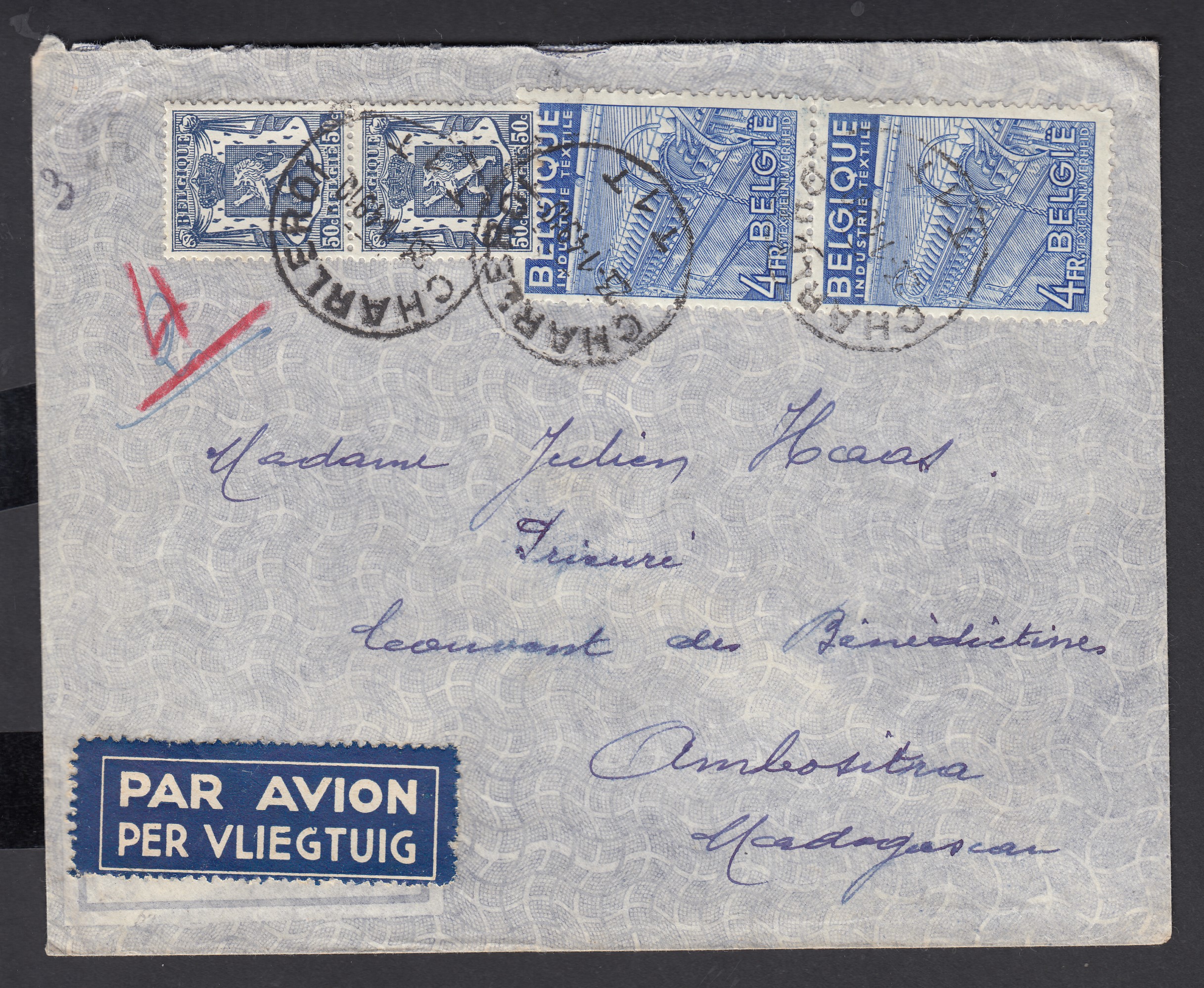 N°426 et 771 en paires sur lettre expédiée par avion de Charleroi le 23.1.1949 à destination de Madagascar.