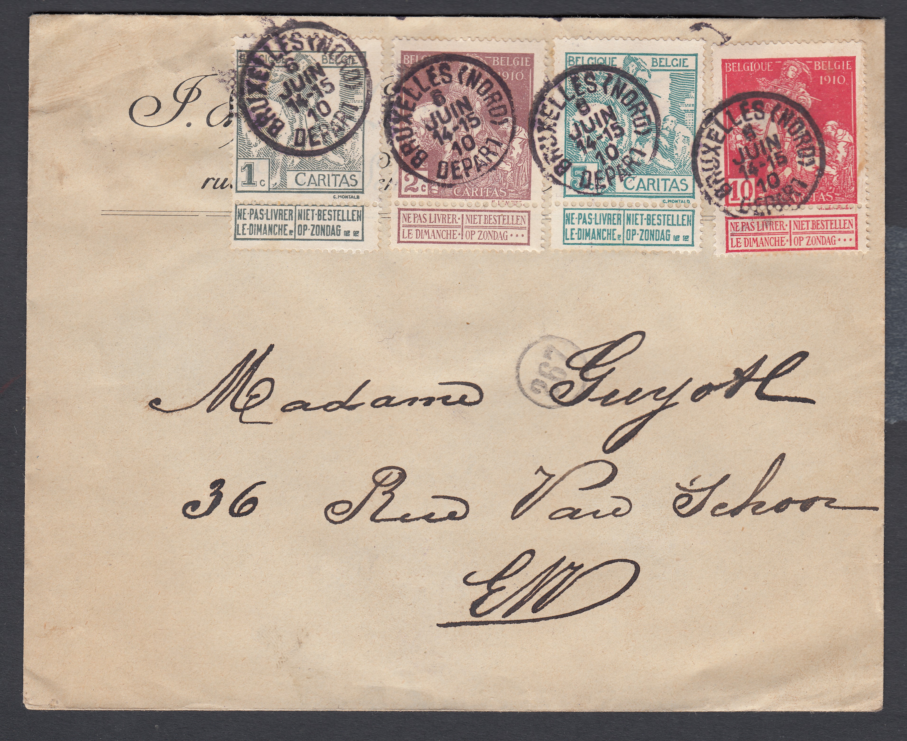 N°84 +86 +89 +91 sur lettre expédiée de et à destination de Bruxelles le 6 juin 1910. Cachet d'arrivée au verso.