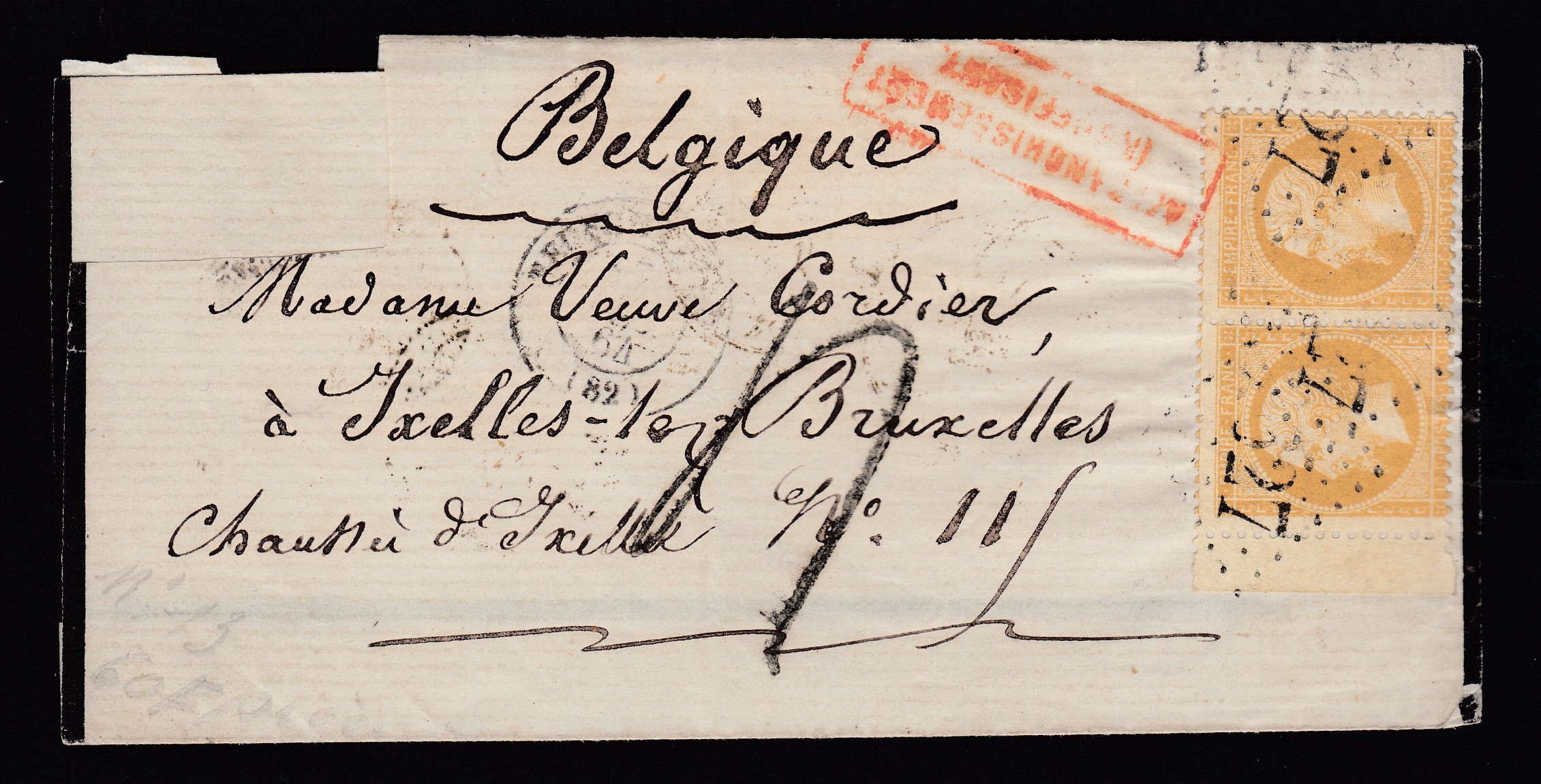 Yv N°21 en paire Bdf sur LAC expédiée de Brie-Comte-Robert (GC 627) à destination de Bruxelles. Cachet rectangulaire encadrée « Affranchissement Insuffisant ». Divers cachets +cachet d'arrivée au verso.