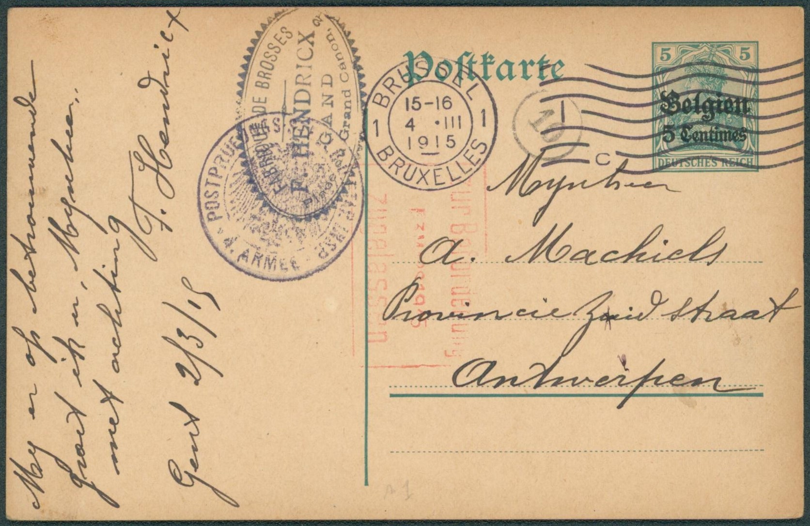 EP ay type 5ctm vert obl mécanique Bruxelles (1915) + cachet armoiries (4e armée) > Antwerpen