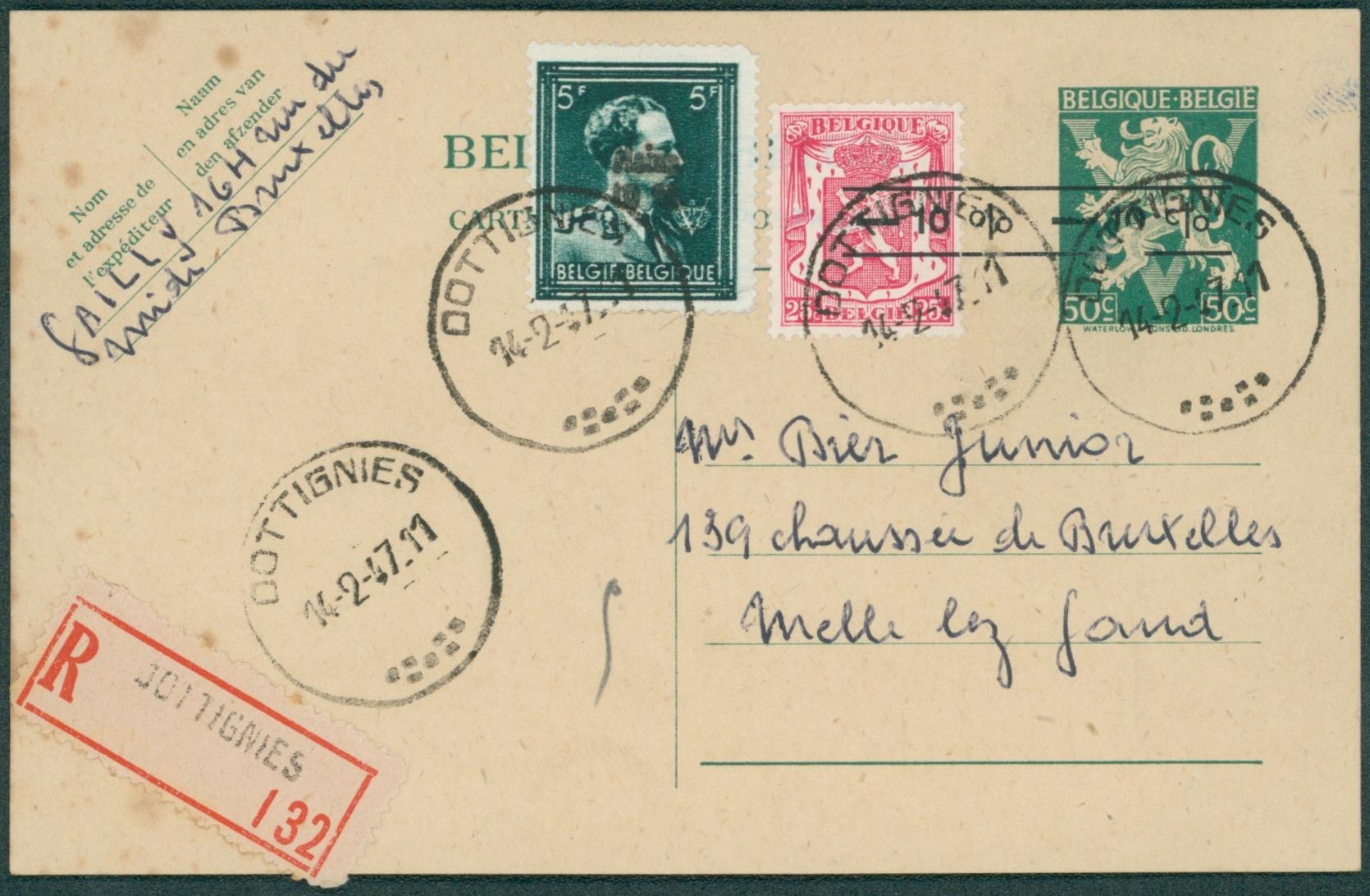 EP au type 50ctm -10% + Affranch. Complé en recommandé de Dottignies (1947) > Melle-lez-Gand