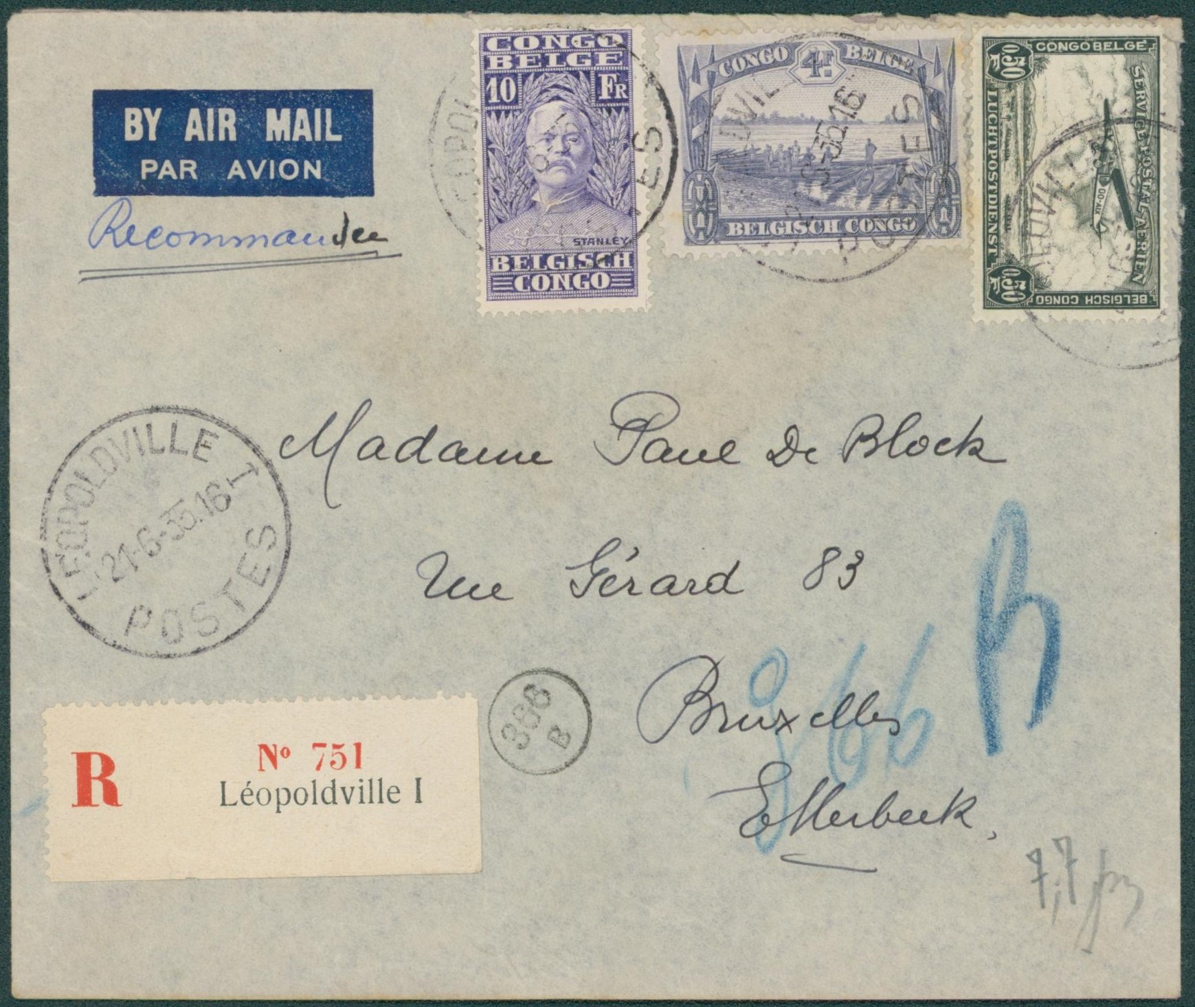 n°180, 148 et PA1 sur lettre en recommandé par avion de Léopoldville > Bruxelles (etterbeek) / Stanley