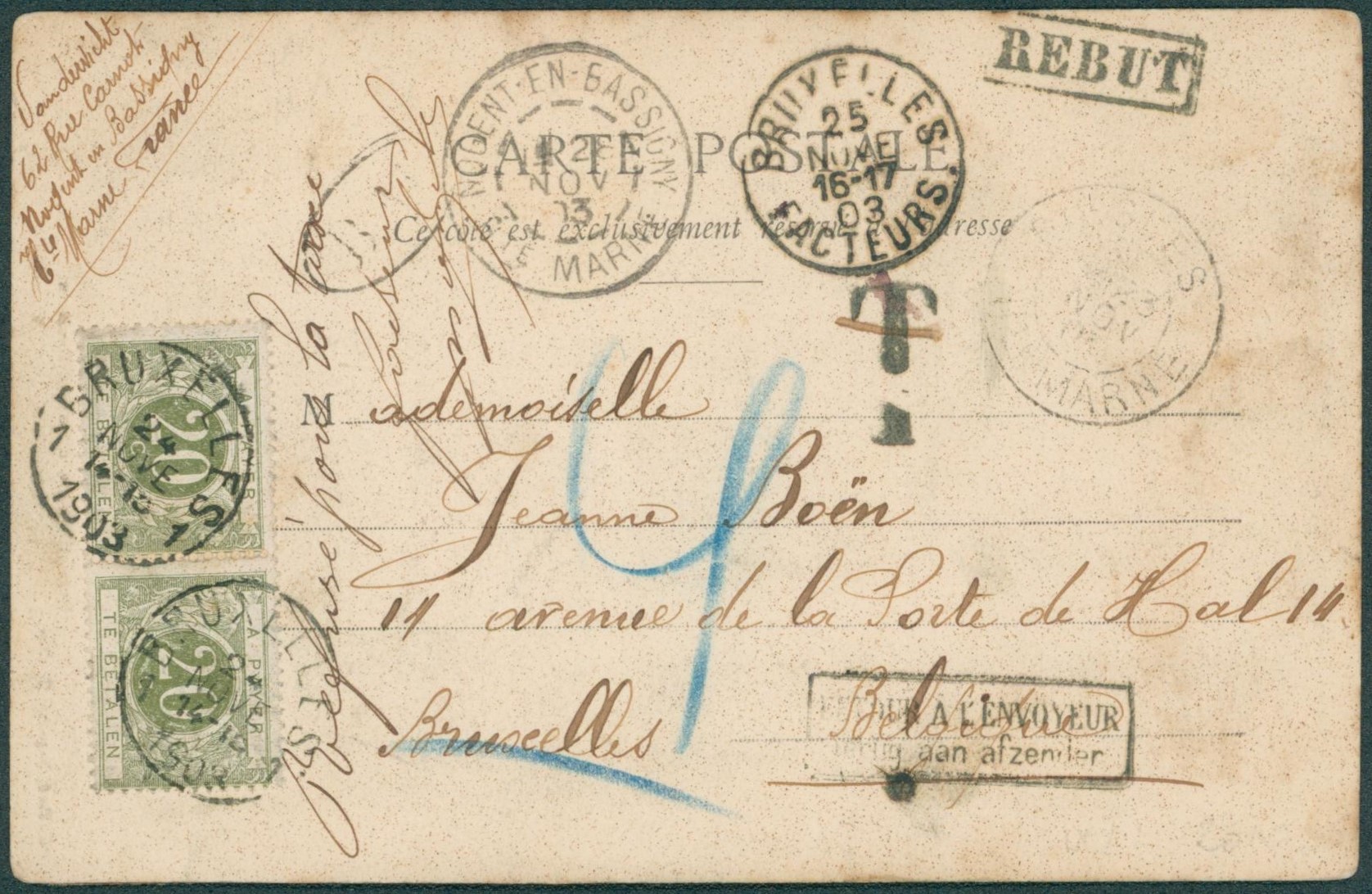 CP expédiée de France (TP au verso) de Nogent-en-Bassigny > Bruxelles, rebut + cachet "Bruxelles / Facteurs" et TX6 en paire. "
