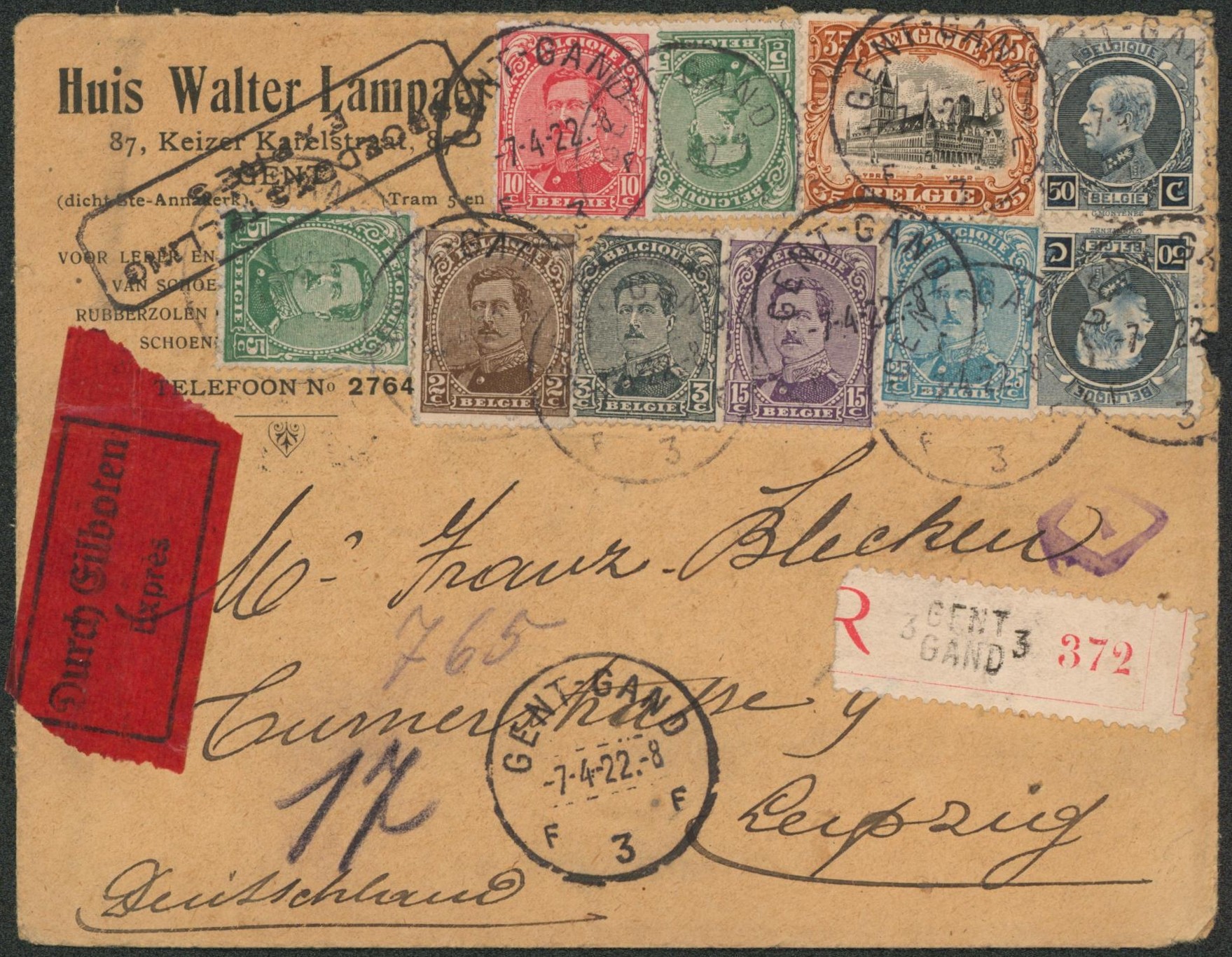 n°136/139, 141/42 et 211 x2 sur lettre en recommandé expres de Gent / Gand > Leipzig (Allemagne).