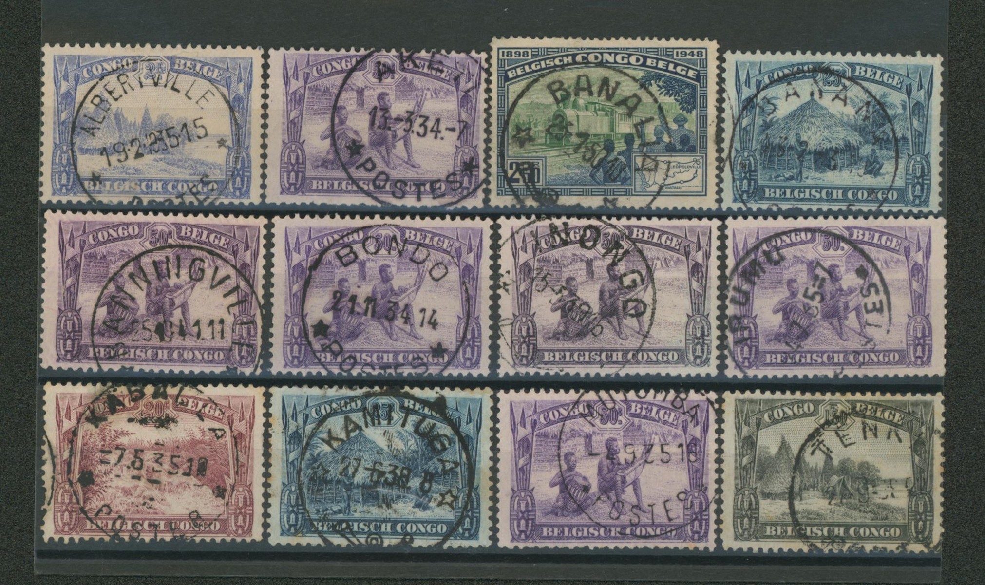 Congo Belge - Scène indigène : ensemble de 12 timbres avec oblitérations choisies. Beau centrage.