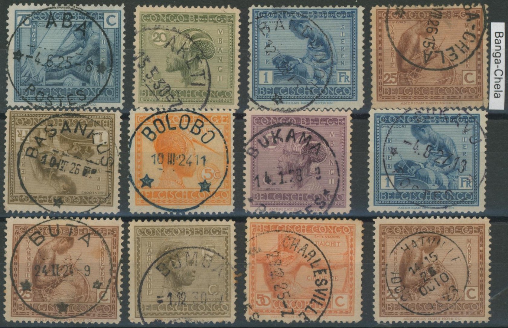 Congo Belge - Vloors : ensemble de 12 timbres avec oblitérations choisies (A > C). Superbe