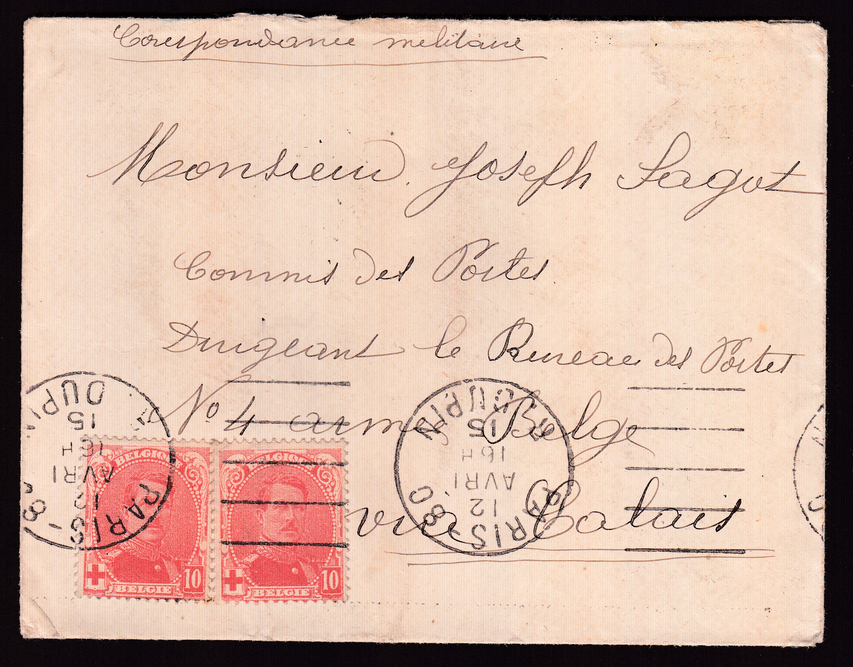 N°130 en paire annulé par l'oblitération mécanique de Paris le 12 avril 15 sur correspondance militaire vers armée belge. Cachet d'arrivée PMB 8bis au verso.