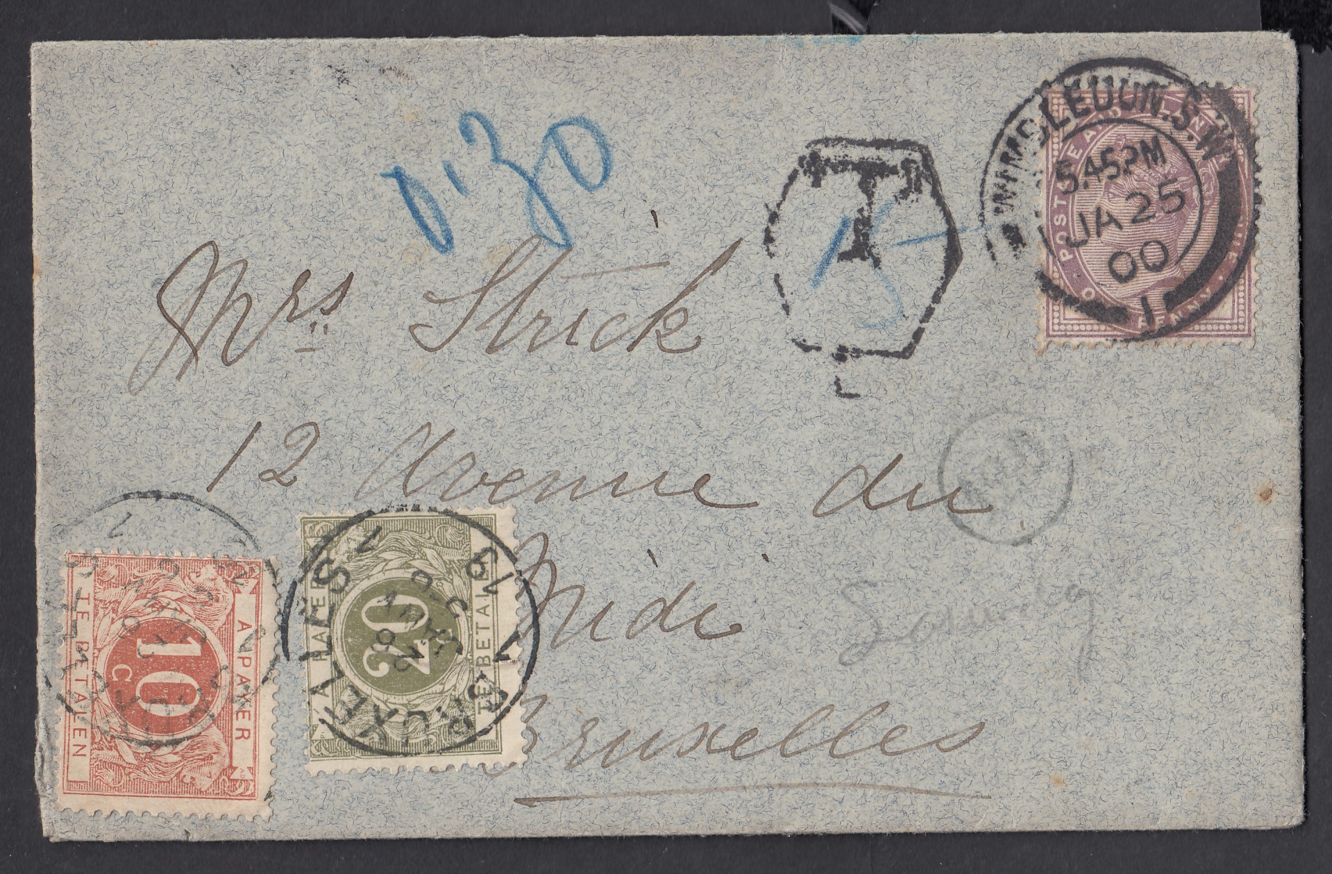 Lettre en provenance d'Angleterre le 25 janv.1900 expédiée à destination de Bruxelles. Taxée ( port de 1P insuffisant) 30c à l'arrivée par Tx4 +Tx6. Cachet d'arrivée au verso.
