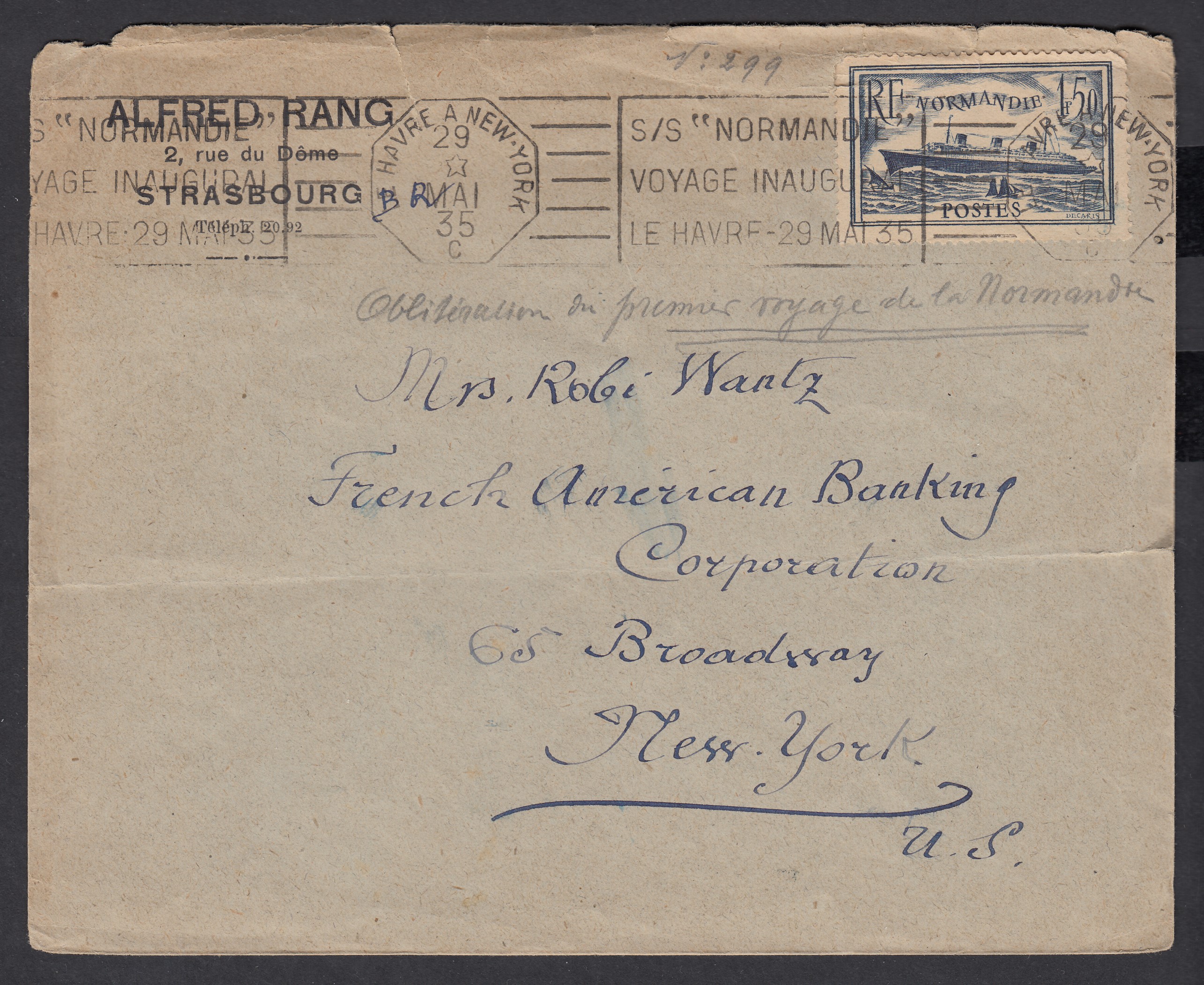 Yv N°299 sur lettre expédiée par paquebot Normandie ( Cachet mécanique « LE HAVRE A NEW-YORK ») le 29 MAI 1935 ( voyage inaugural ) à destination de New-York.