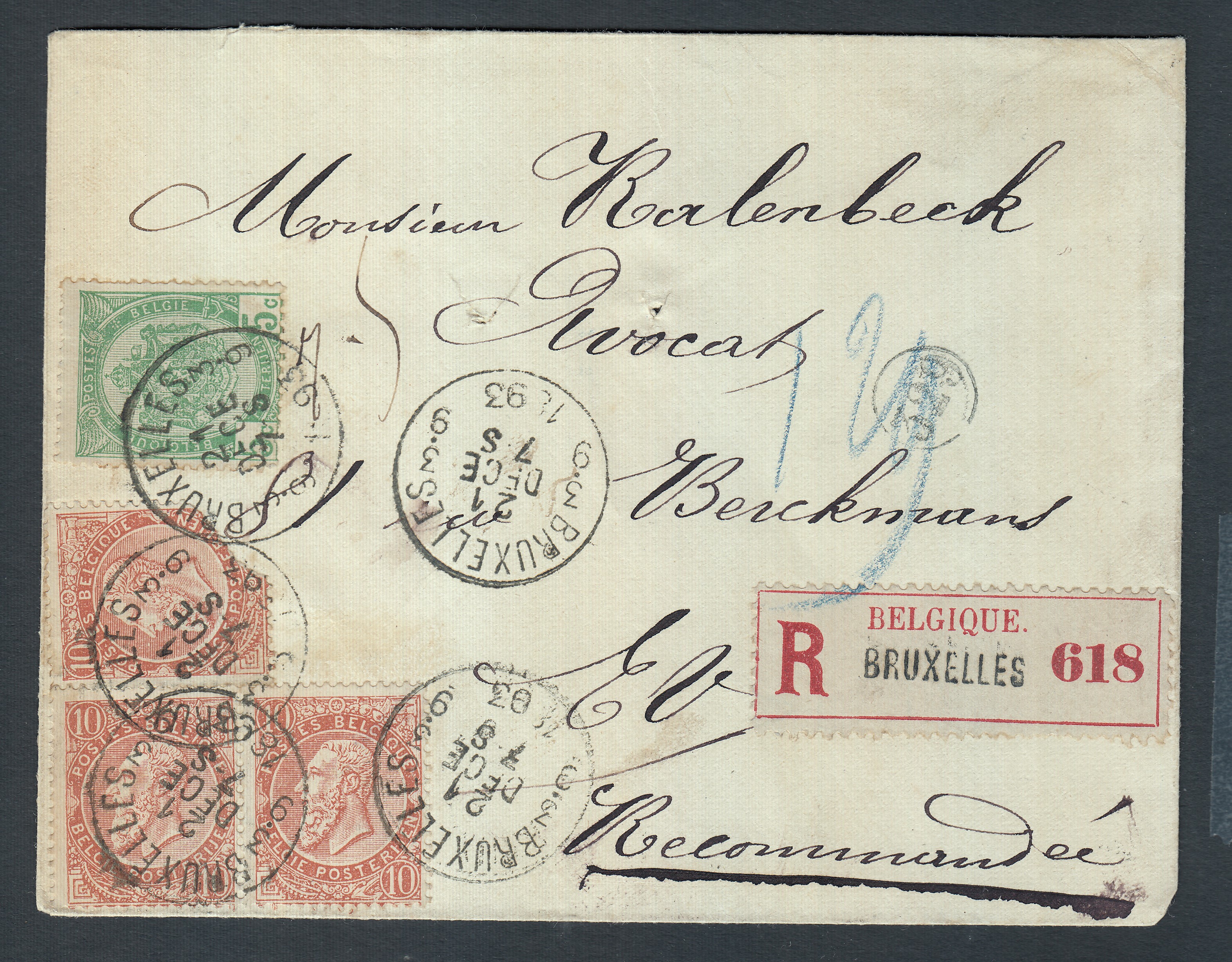 N°56 +57x3 ( 1 Tp abîmé) sur lettre expédiée en recommandé de et à destination de Bruxelles ( Cachet fractionnaire 3/9) le 21 déc.1893.