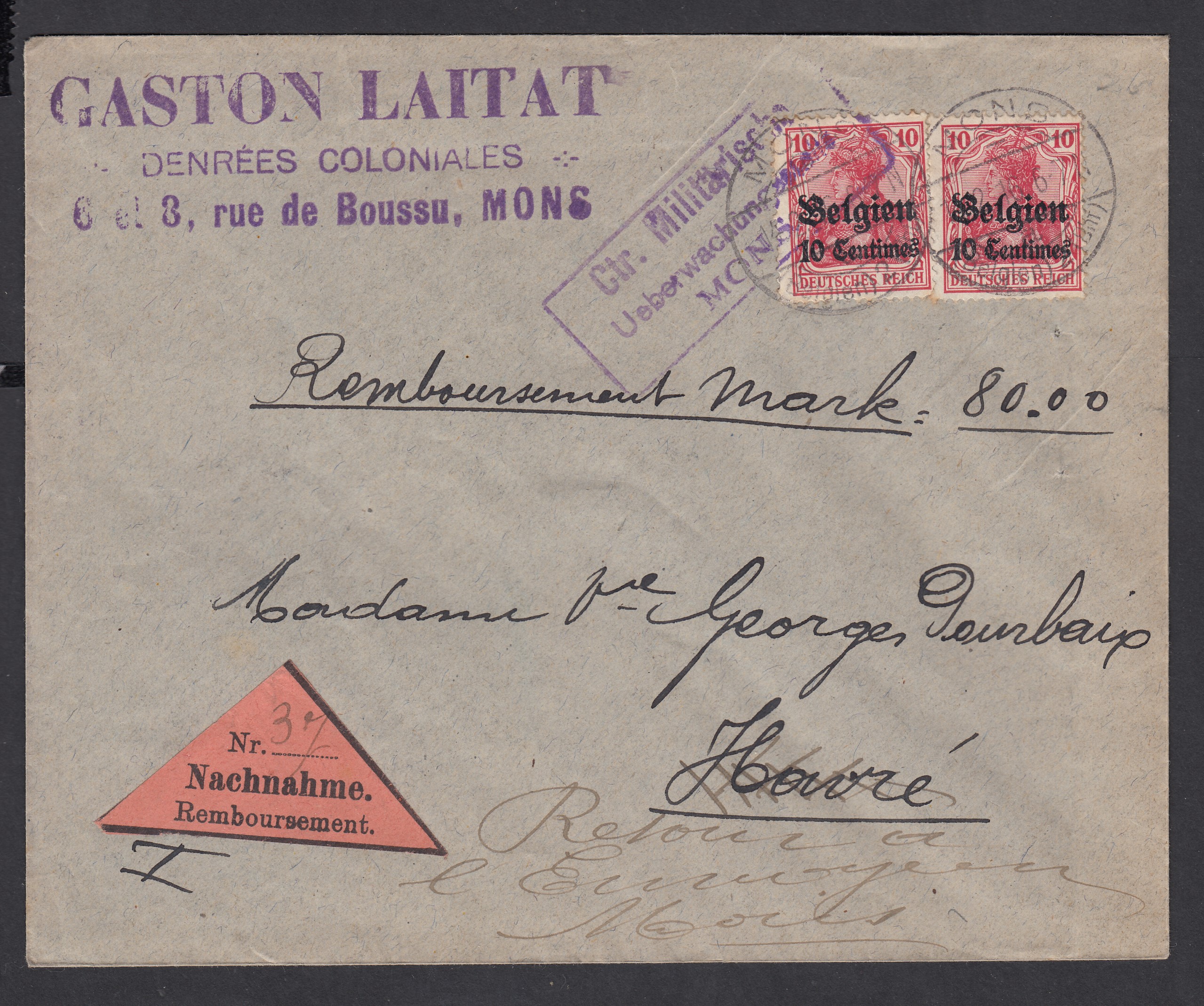 N°Oc3x2 sur lettre expédiée contre remboursement de Mons ( Cachet rectangulaire de censure de MONS) le 14.12.1916 à destination de Havré, biffé et manuscrit « Retour à l'envoyeur ». Cachet d'arrivée au verso.