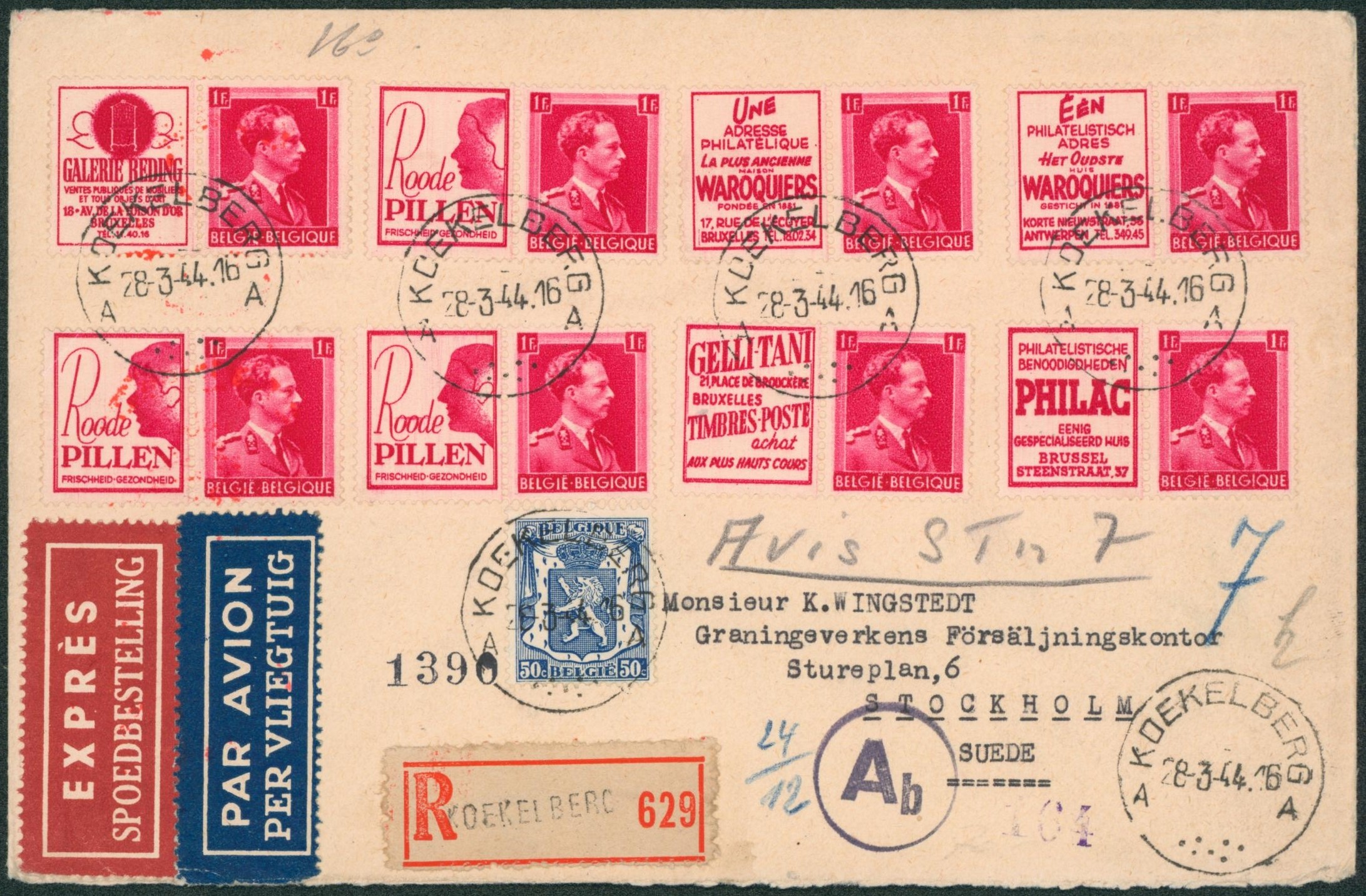 WWII - PU146/47, PU155, PU162/64, PU168/69 + n°426 sur lettre en recommandé expres et par avion de koekelberg > Stockholm (Suède). Censure