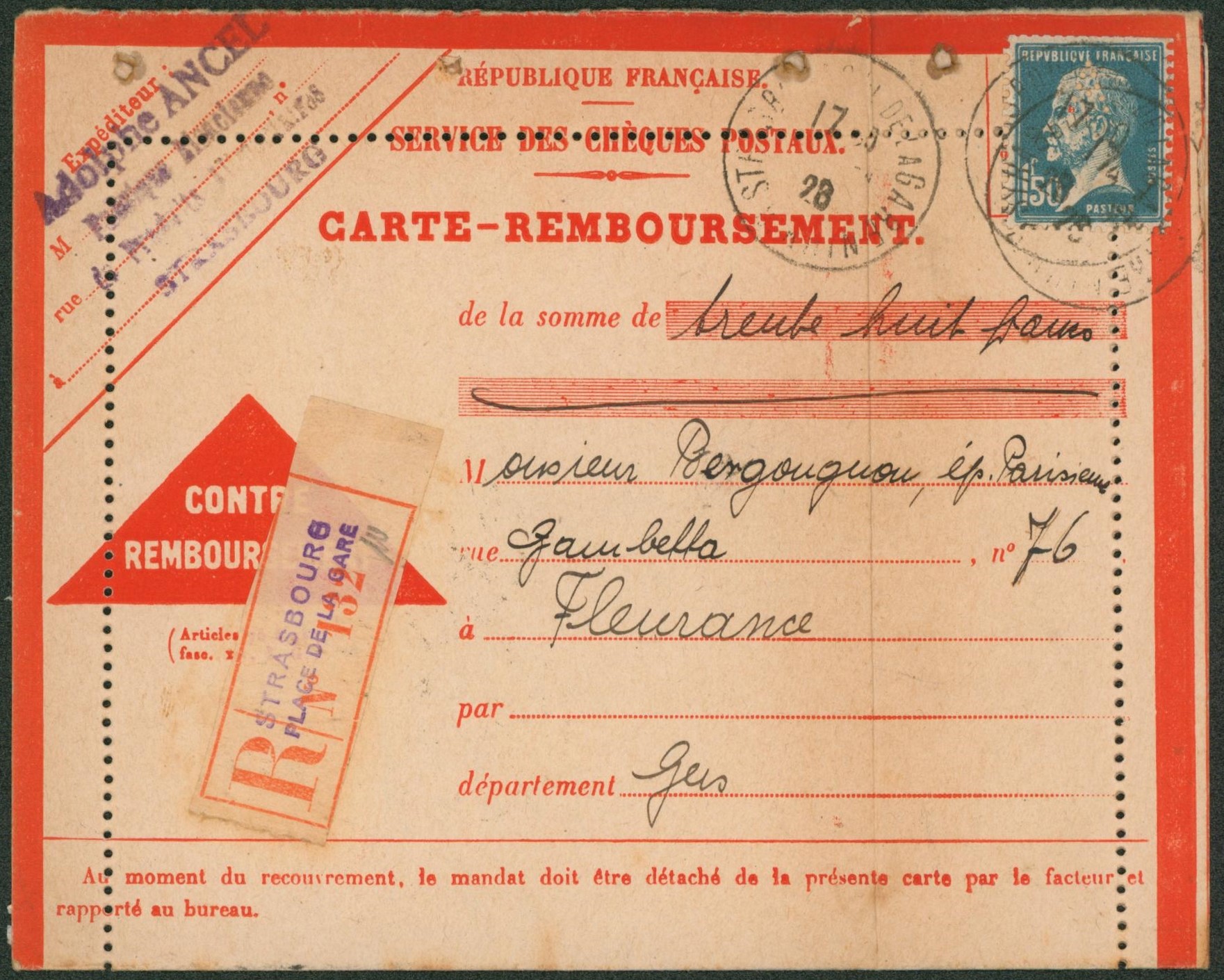 Yv n°181 sur carte-remboursement (38 Fr) en recommandé de Strasbourg > Fleurance / Service des chèques postaux