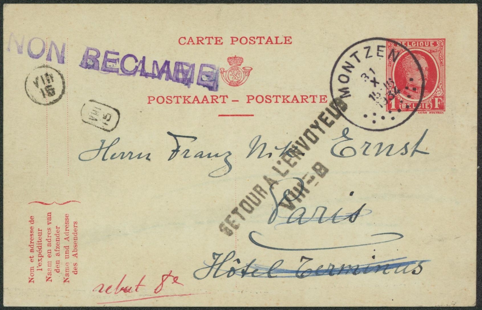 EP au type 1F rouge houyoux (trilingue) expédié de Montzen > Paris. Non réclamé, retour à l'envoyeur, rebut en rouge. Canton de l'est
