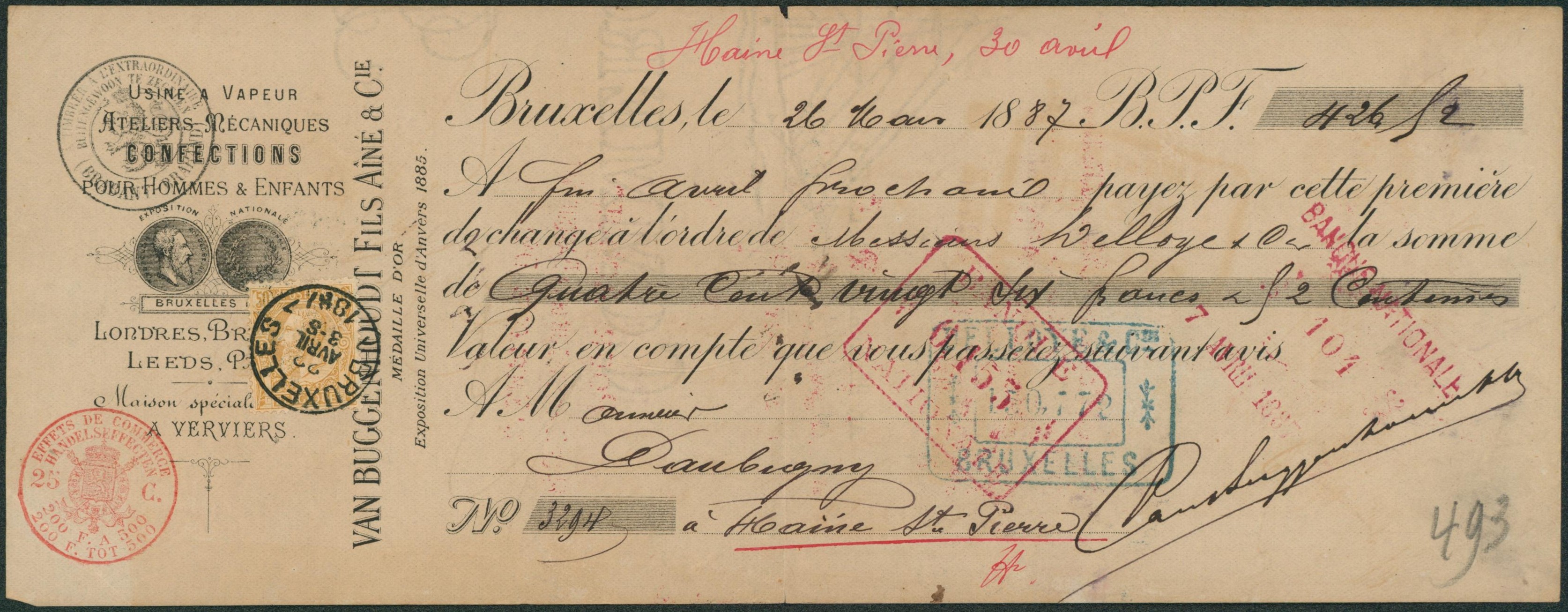 n°50 sur effet de commerce ateliers mécanique, confections pour Hommes et enfants, annotation en rouge Haine-St-Pierre le 30 Avril.