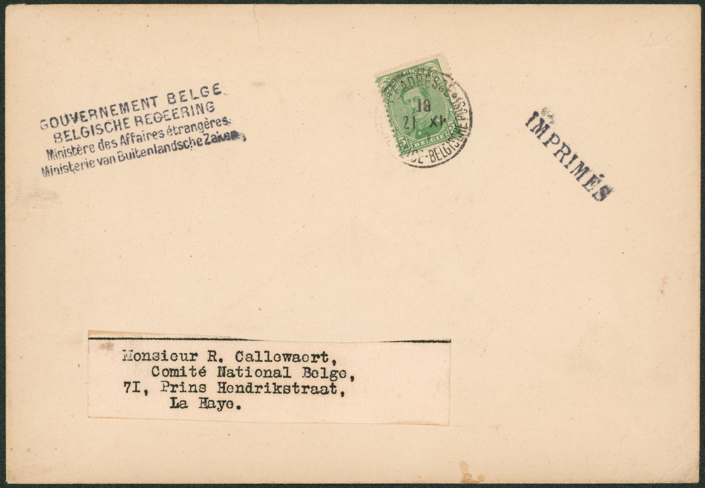 n°137 sur imprimé "Gouvernement belge, ministère des affaires étrangères" > La Haye. "
