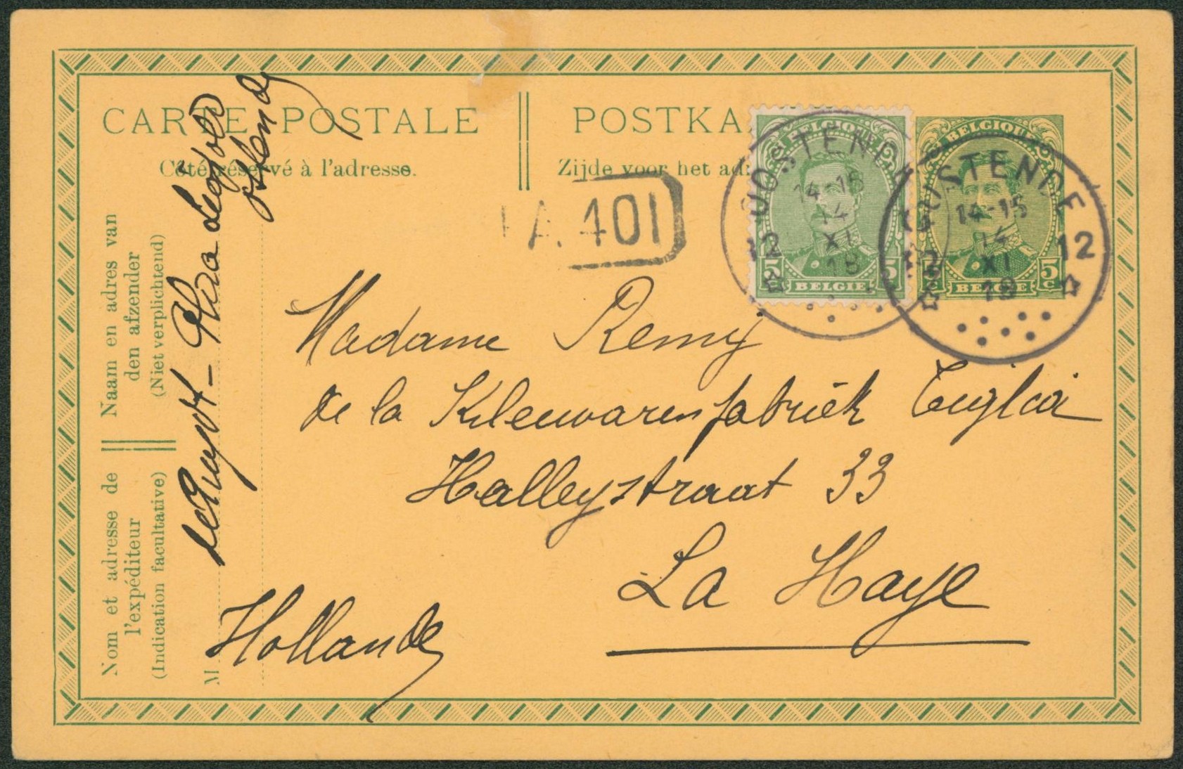 EP au type 5ctm vert + n°137 obl agence de fortune Oostende 12 > La Haye.