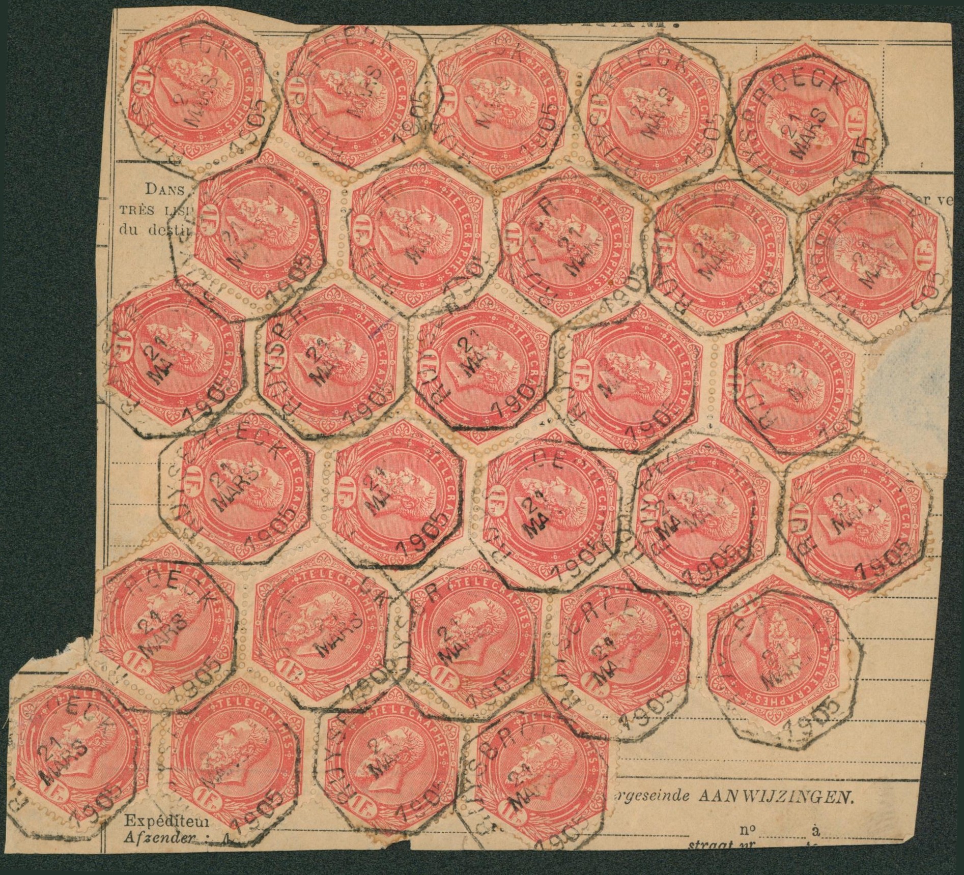 TG16 en bloc de 28 + 1 sur grand fragment de télégramme obl télégraphique "Ruysbroek". Superbe et rare"