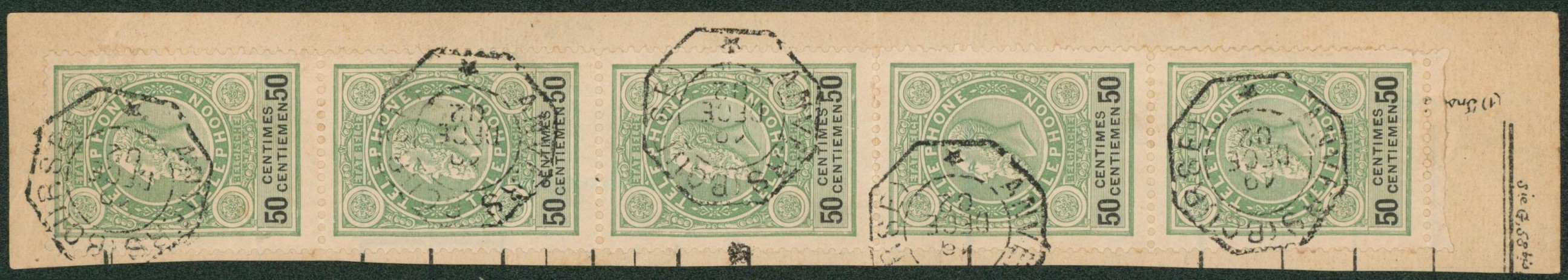 TE23 en bande de 5 sur fragment de télégramme obl télégraphique "Anvers (bourse)". Rare "
