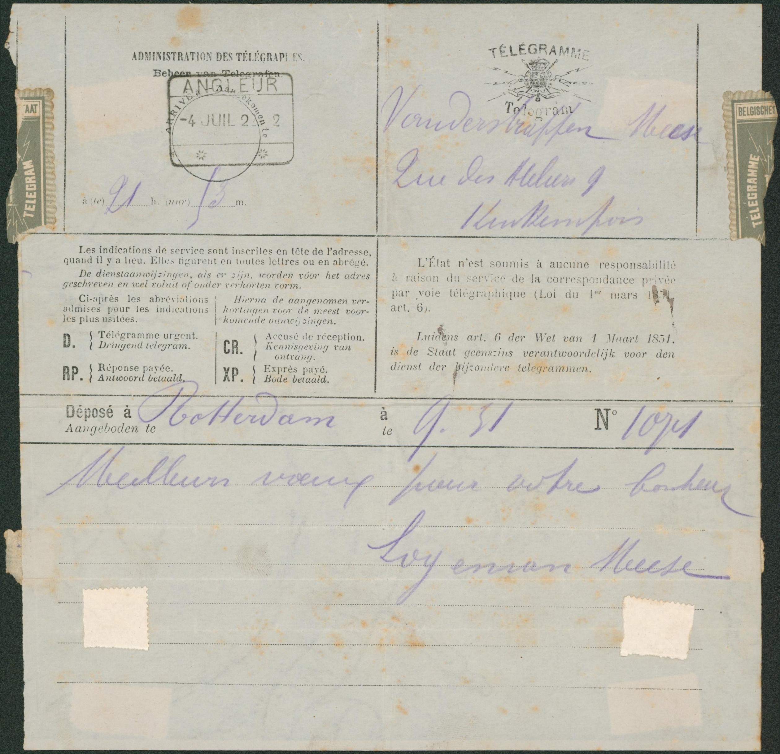 Télégramme (formule bilingue) déposé à Rotterdam > Angleur çàd arrivée obl chemin de fer.
