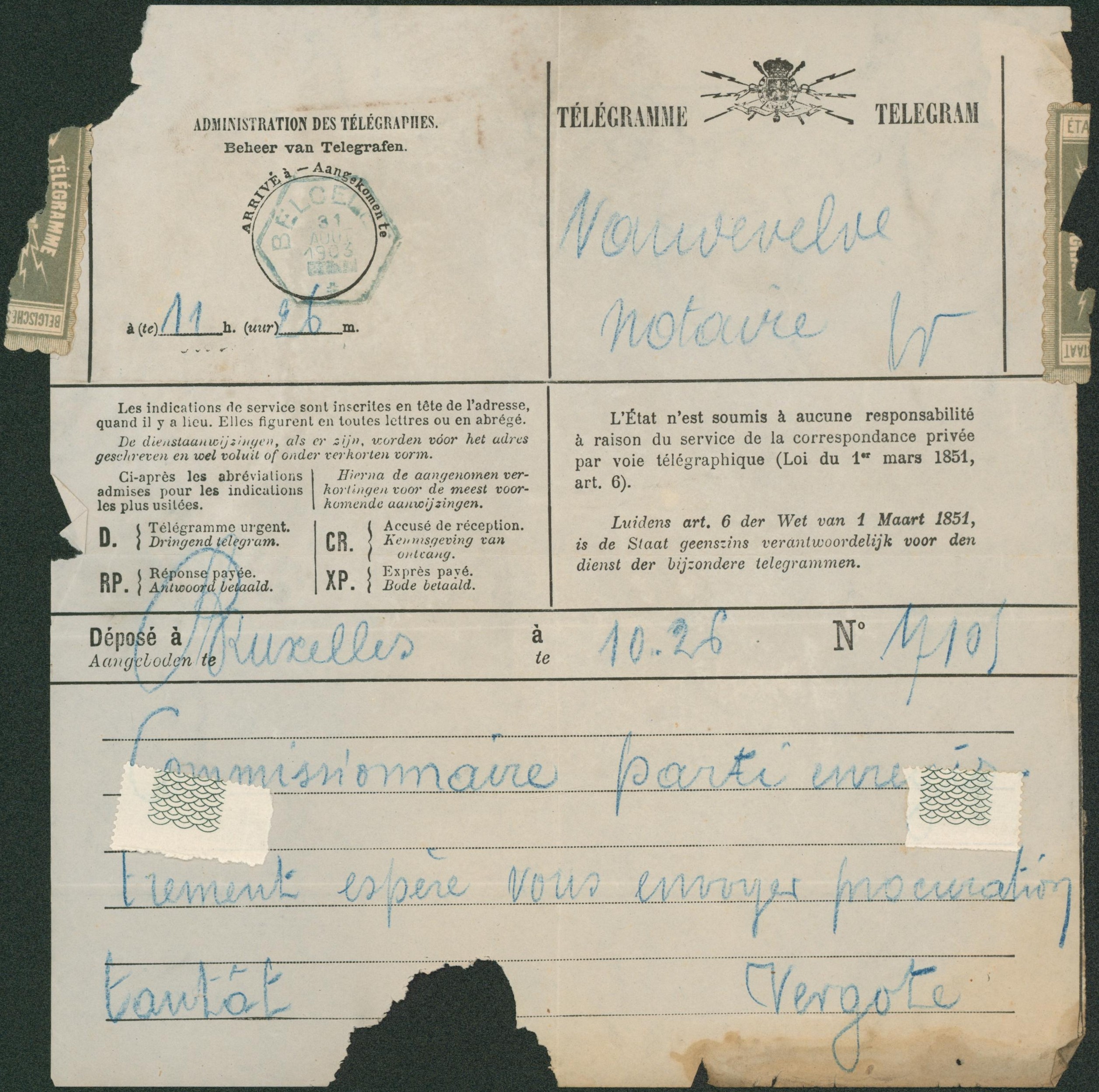 Télégramme (formule bilingue) déposé à Bruxelles > Belcele çàd arrivée obl chemin de fer hexagonale bleue. TB