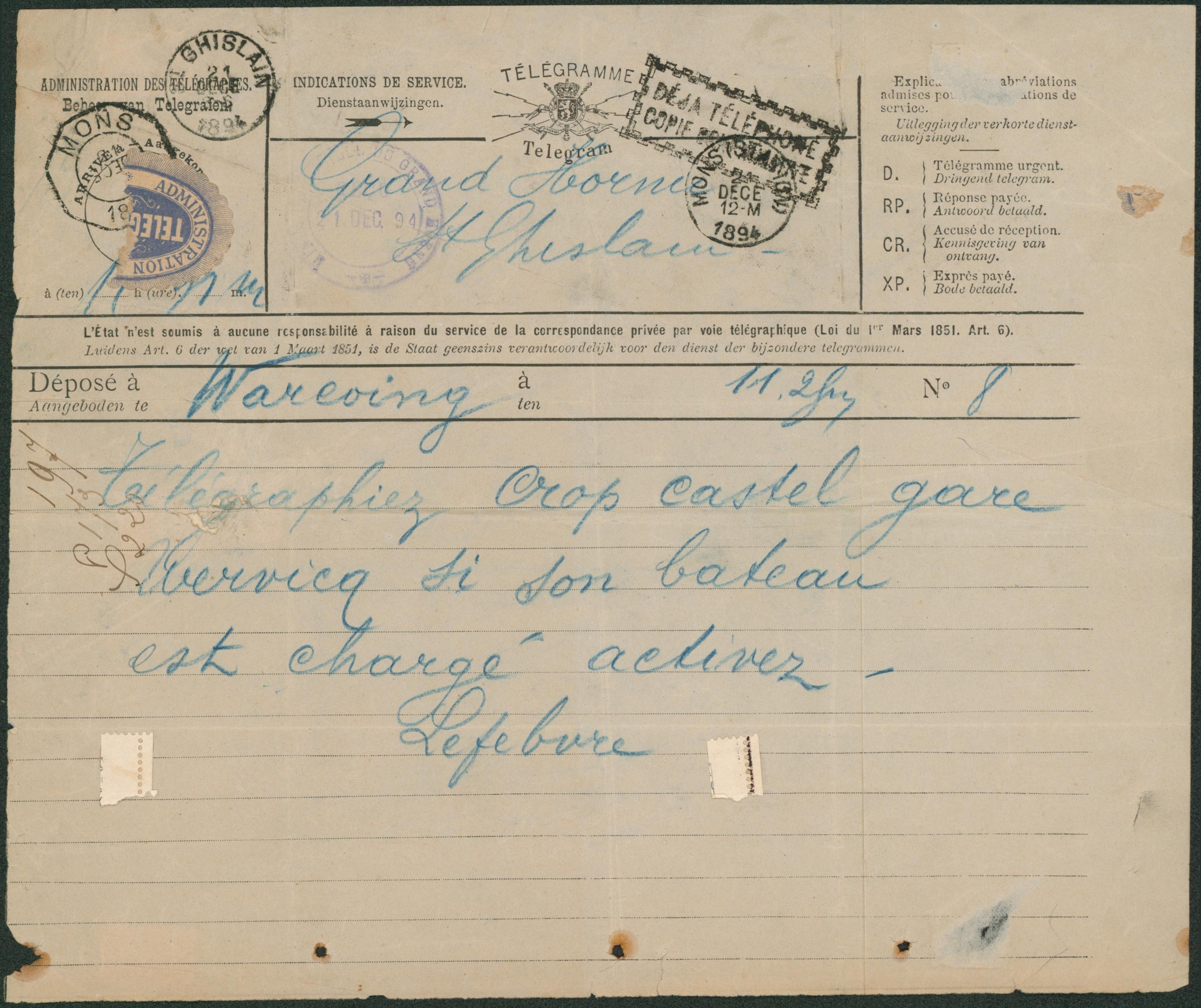 Télégramme (bilingue) déposé à Warcoing > Mons çàd obl télégraphique via Mons (station) acheminé vers St-Ghislain.