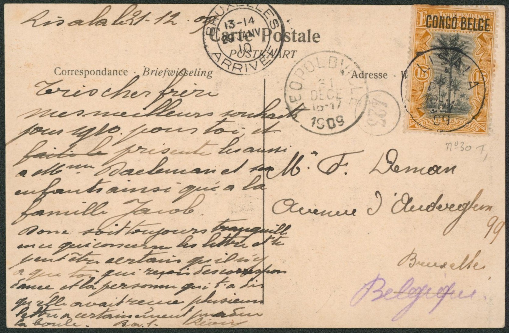 Congo Belge - Mols 15ctm surchargé sur CP vue expédiée de Lisala via Léopoldville > Bruxelles.