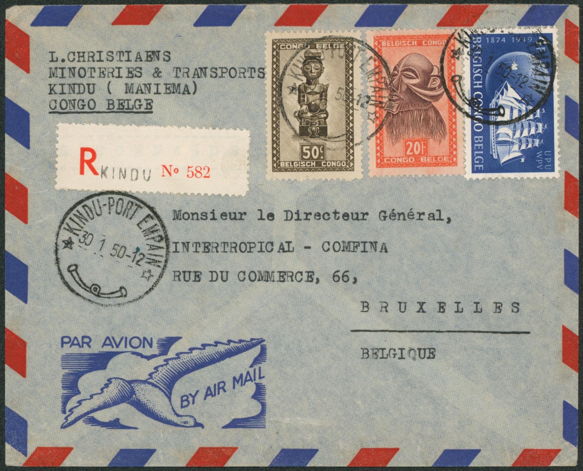 Congo Belge - Affranch. Mixte (masques) sur lettre par avion en recommandé de Kindu-Port empain > Bruxelles