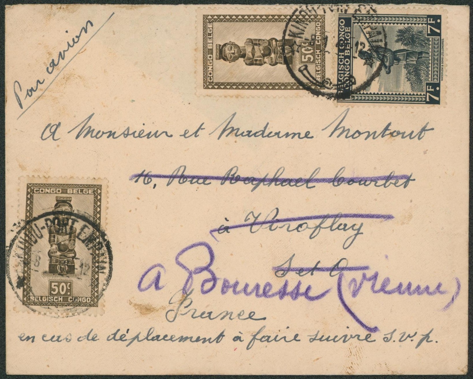 Congo Belge - Affranch. Mixte (masques) sur lettre expédié par avion de Kindu-port empain > Viroflag redirigée Bouresse (France)
