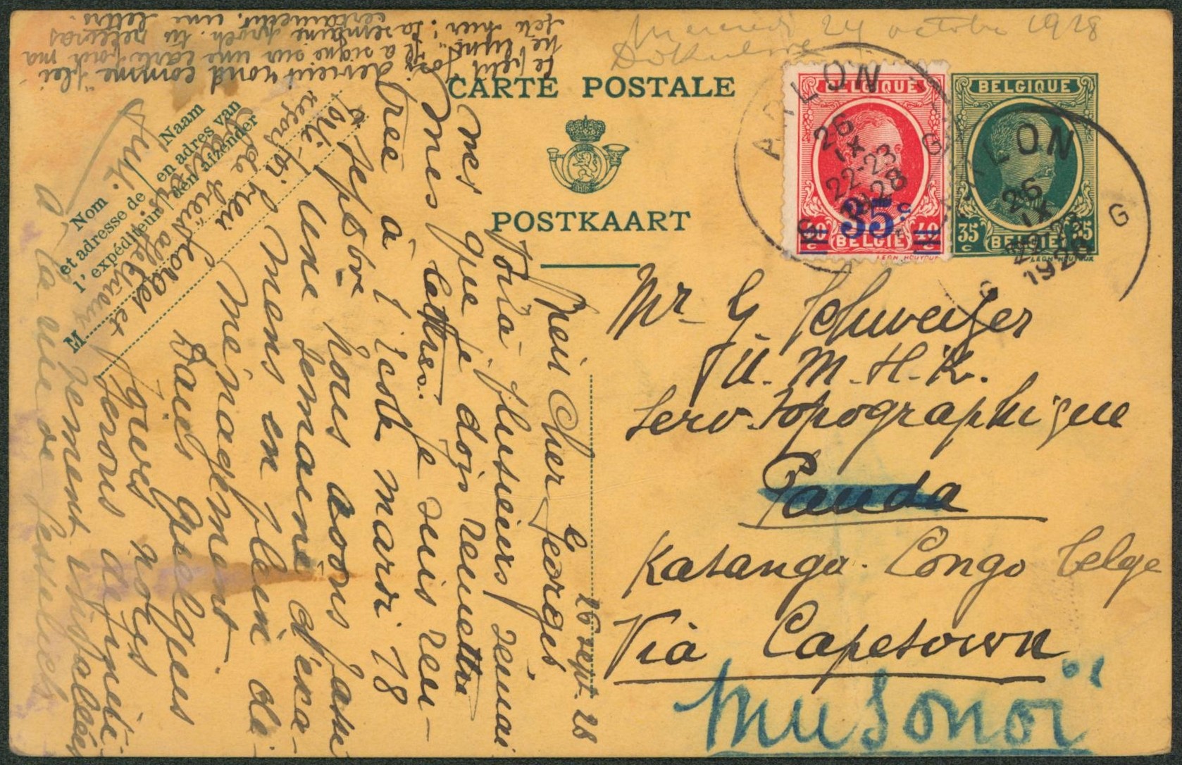 EP au type 35ctm vert Houyoux + n°247 expédié de Arlon > Panda (Katanga) redirigé Musonoï / Pli.