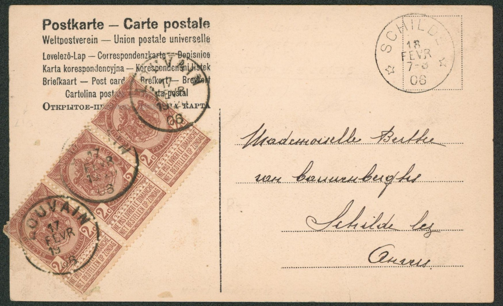 n°55 en bande de 3 sur CP vue expédié de Louvain > Schilde çàd obl relais.